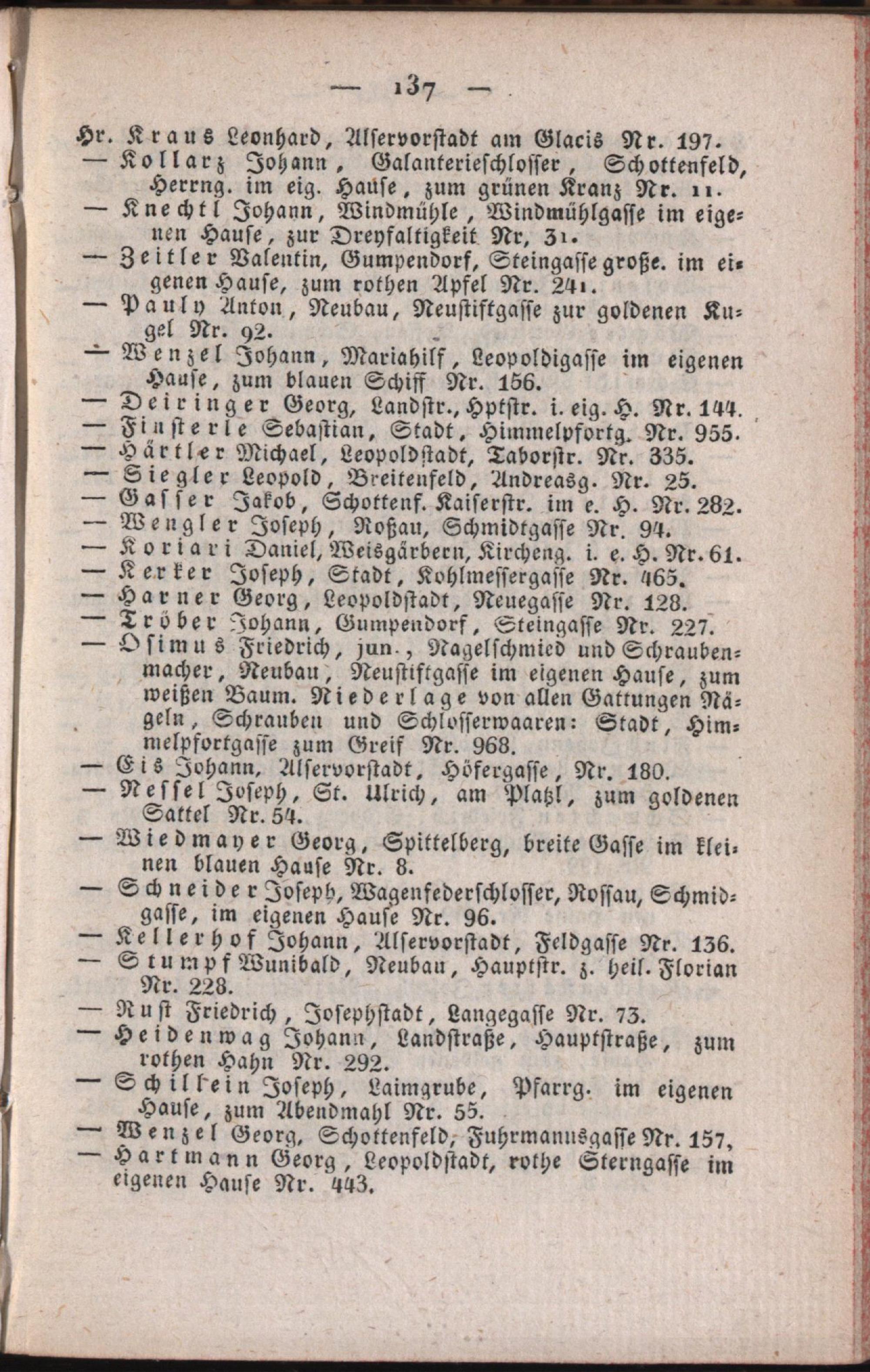 Adreß-Buch der ehrsamen Handwerks-Innungen in der k.k. Haupt- und Residenzstadt Wien, für das Jahr 1827 : enthaltend ein genaues Nahmens-Verzeichnis aller dermahligen Herrn Vorsteher und bürgerlichen Meister, sodann der Befugten jeder Innung, nebst Angabe der Wohnungen und Verkaufsgewölbe (Stadt, Vorstadt, Polizey-Bezirk, Haus Nr.) der zurückzulegenden Lehrjahre und der Herbergsorte ; zum leichteren Aufsuchen für Einheimische und Fremde / hrsg. von Franz Rittler