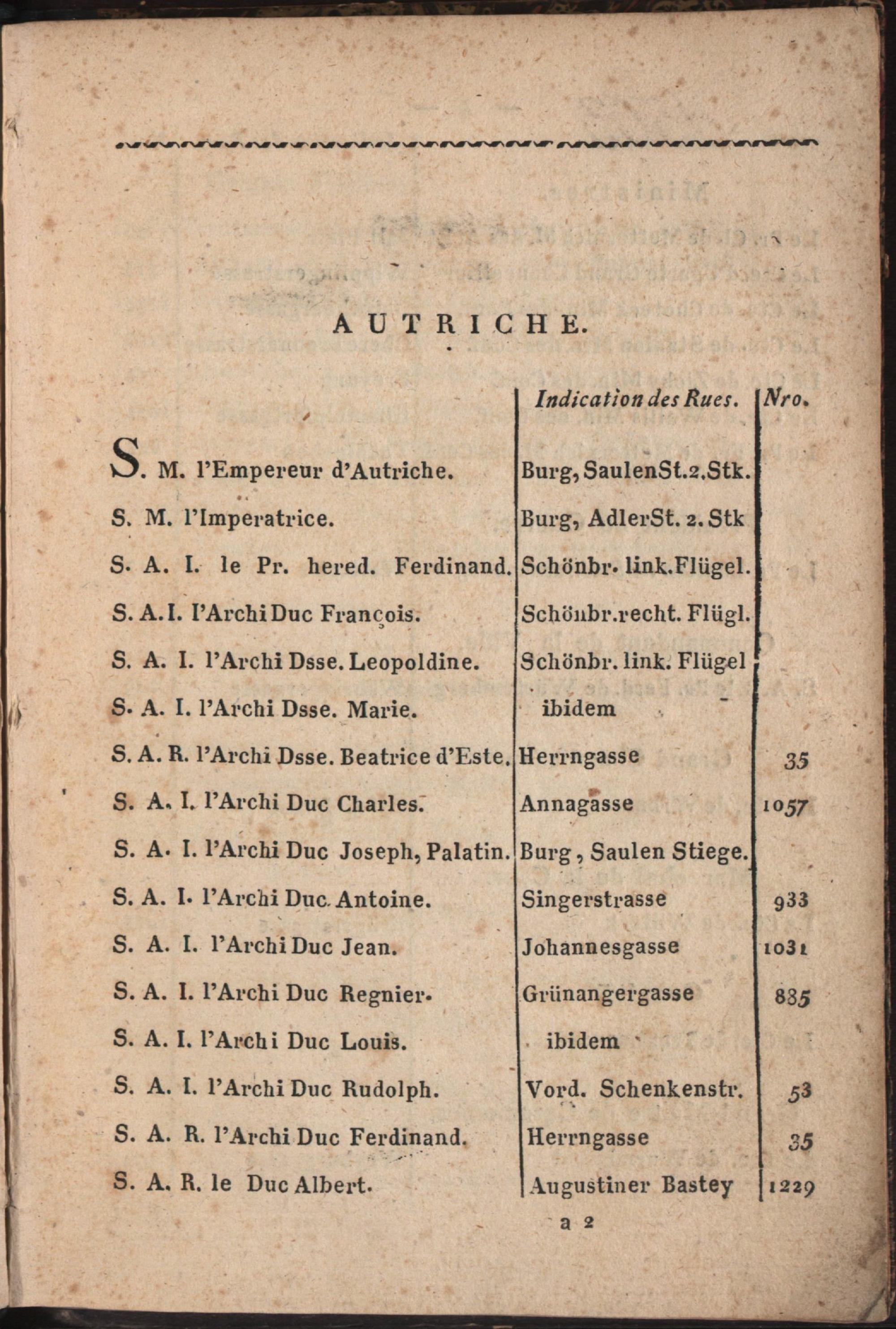 Guide des étrangers à Vienne pendant le congrès : contenant les noms des souverains présents dans cette capitale, ainsi que ceux des ministres et chargés d'affaires des differentes cours auprès de celle de Vienne au mois de Janvier 1815 ; avec l'indication des rues et numero des maisons qu'ils habitent / [Jean Gaggiám]