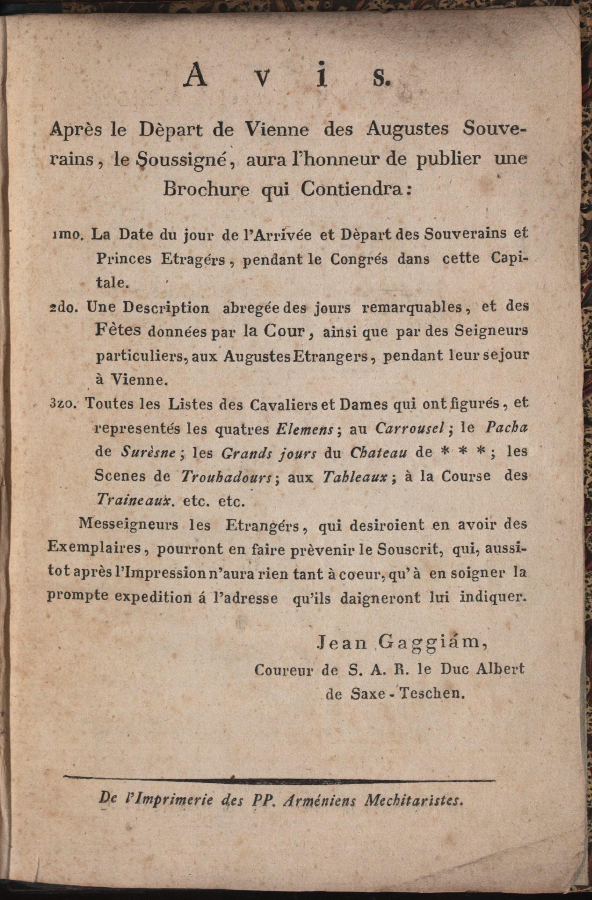 Guide des étrangers à Vienne pendant le congrès : contenant les noms des souverains présents dans cette capitale, ainsi que ceux des ministres et chargés d'affaires des differentes cours auprès de celle de Vienne au mois de Janvier 1815 ; avec l'indication des rues et numero des maisons qu'ils habitent / [Jean Gaggiám]