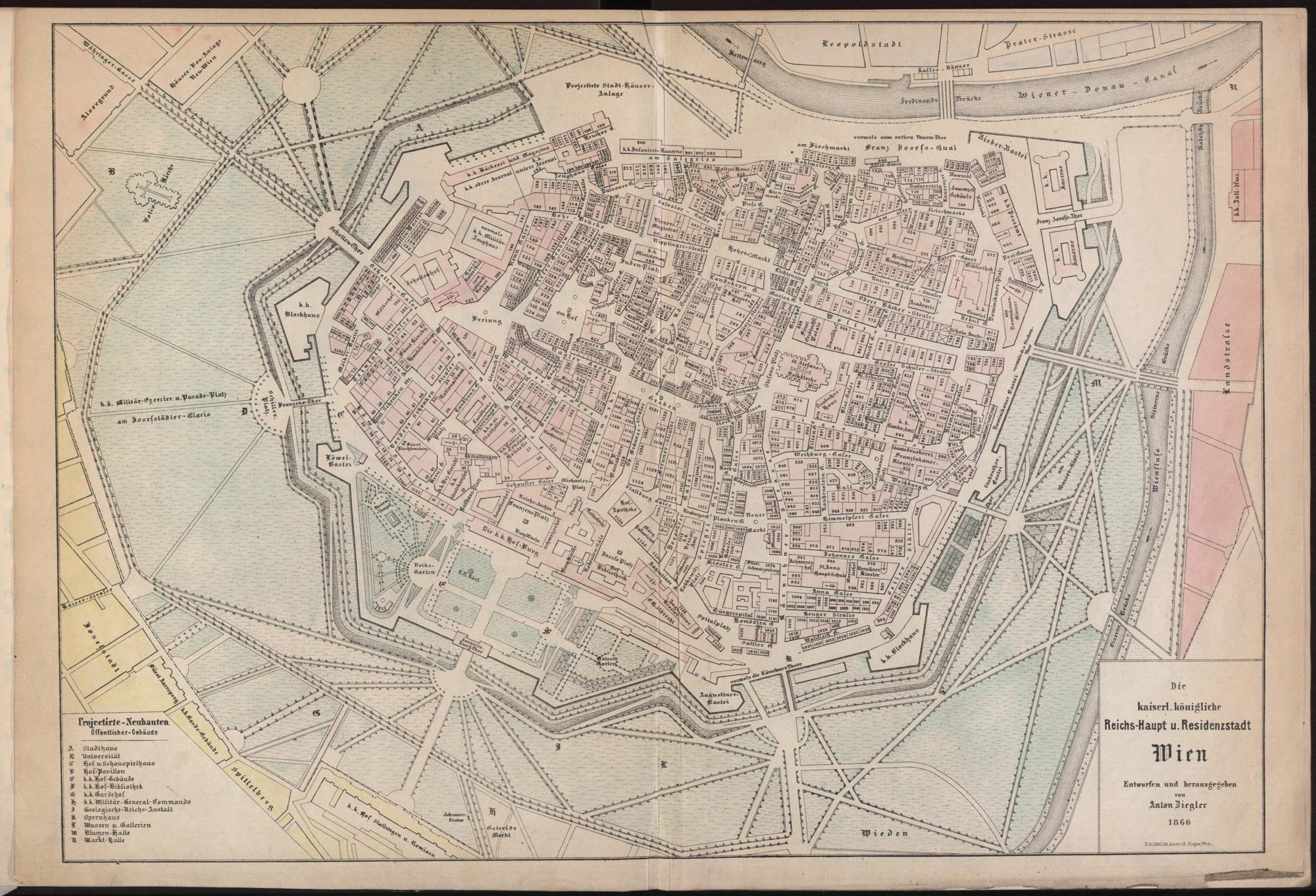 Neuester Wiener Häuser-Schema für das Jahr 1861 : kaiserl. königl. Reichshaupt- und Residenzstadt Wien mit sämmtlichen Vorstädten, eingetheilt in acht kaiserliche königliche Polizei-Bezirke mit Angabe der Haueigenthümer etc. etc. nebst colorirten Grundrissen zur leichtfaßlichen Auffindung der Straßen und der mit Nummern bezeichneten Gebäude / entworfen und hrsg. von Anton Ziegler