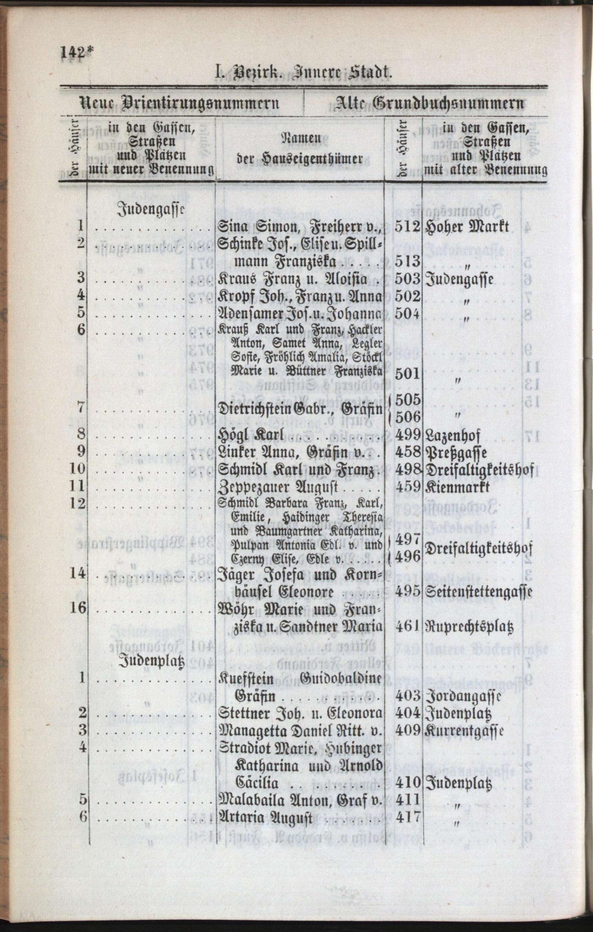 1: Stadt : Nachweis der alten und neuen Benennungen der Gassen, Straßen und Plätze in alphabetischer Ordnung