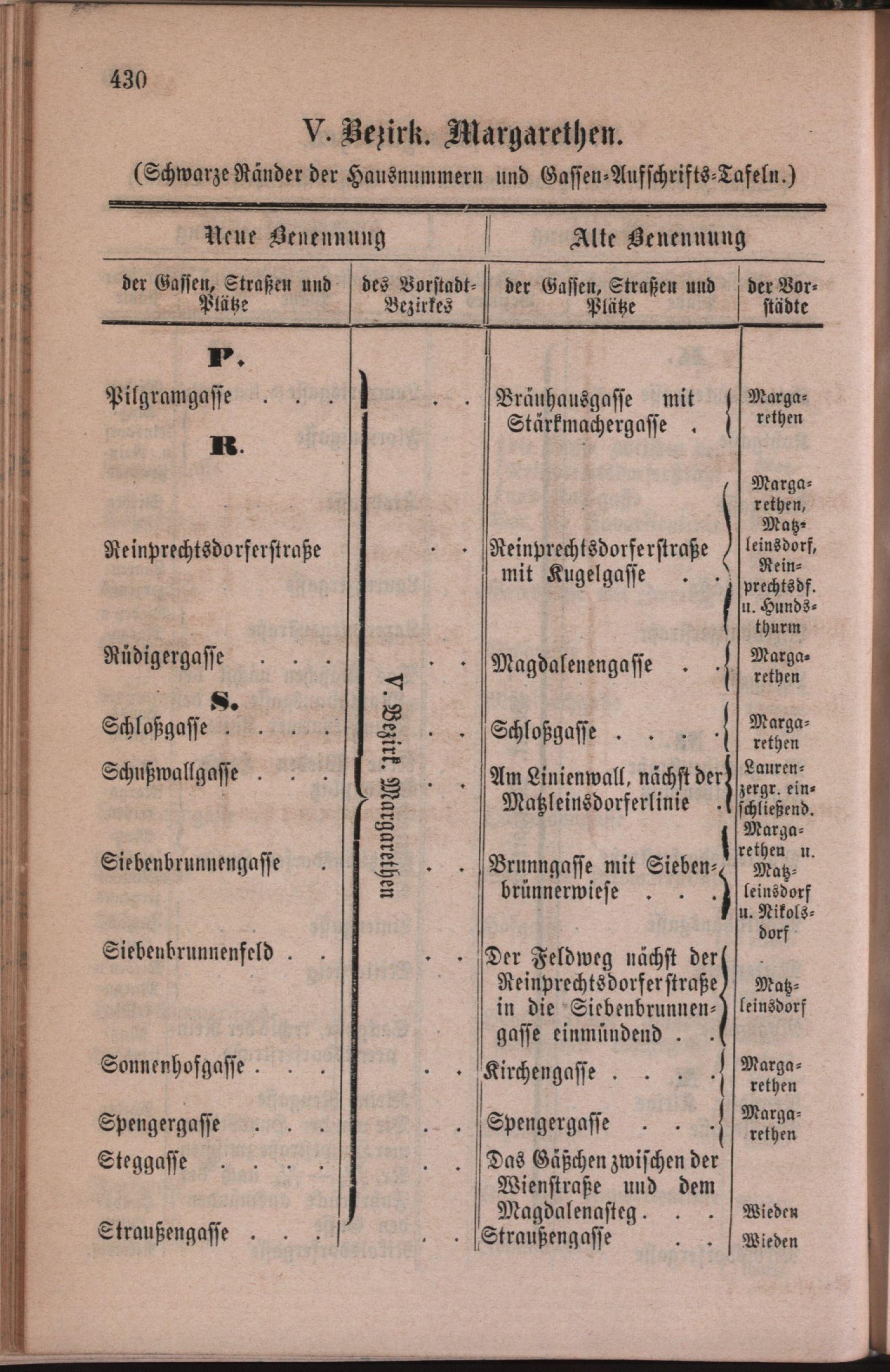 5: Margarethen : Nachweis der alten und neuen Benennungen der Gassen, Straßen und Plätze in alphabetischer Ordnung