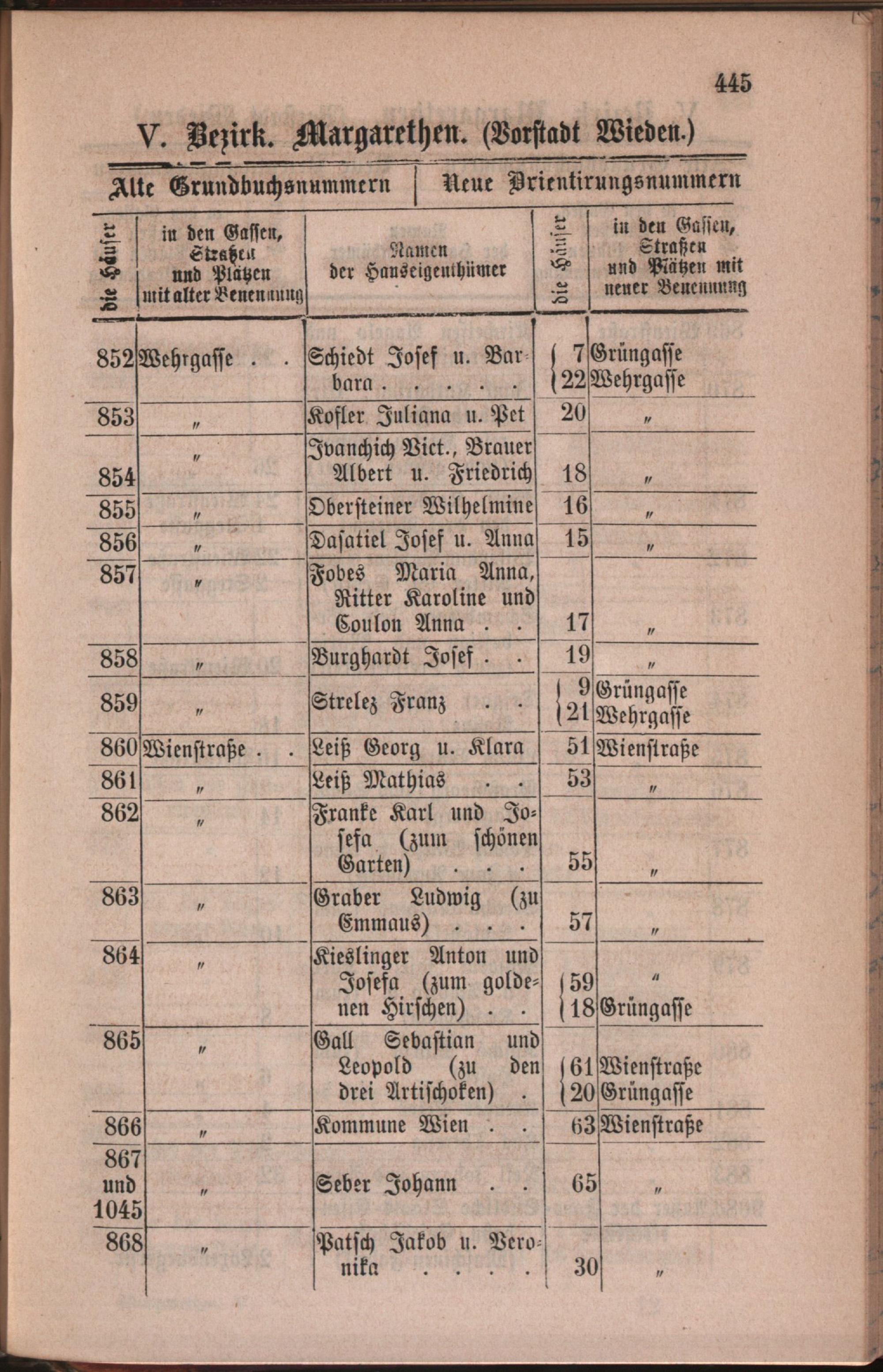 5: Margarethen : Nachweis der alten und neuen Benennungen der Gassen, Straßen und Plätze in alphabetischer Ordnung