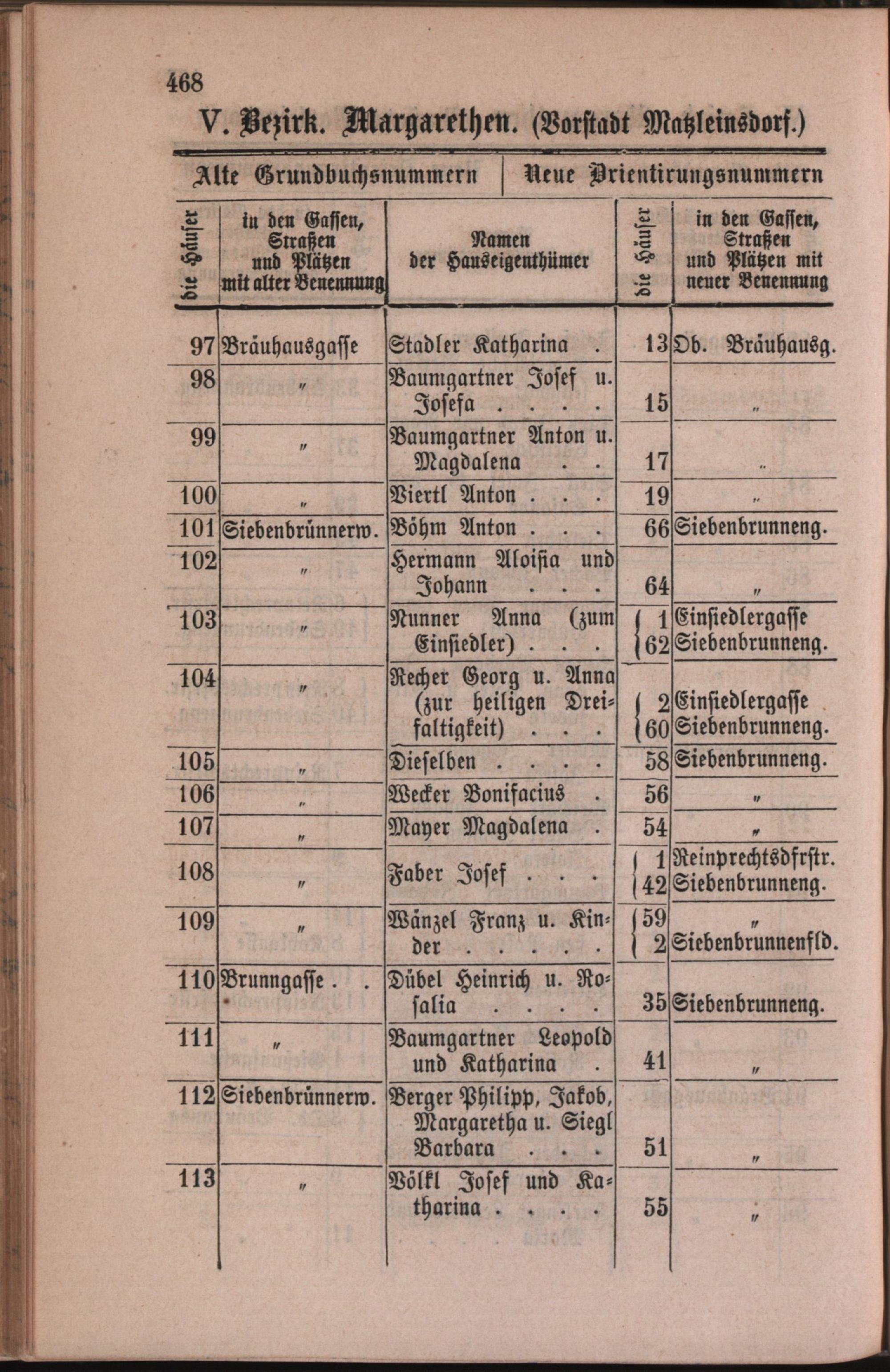5: Margarethen : Nachweis der alten und neuen Benennungen der Gassen, Straßen und Plätze in alphabetischer Ordnung