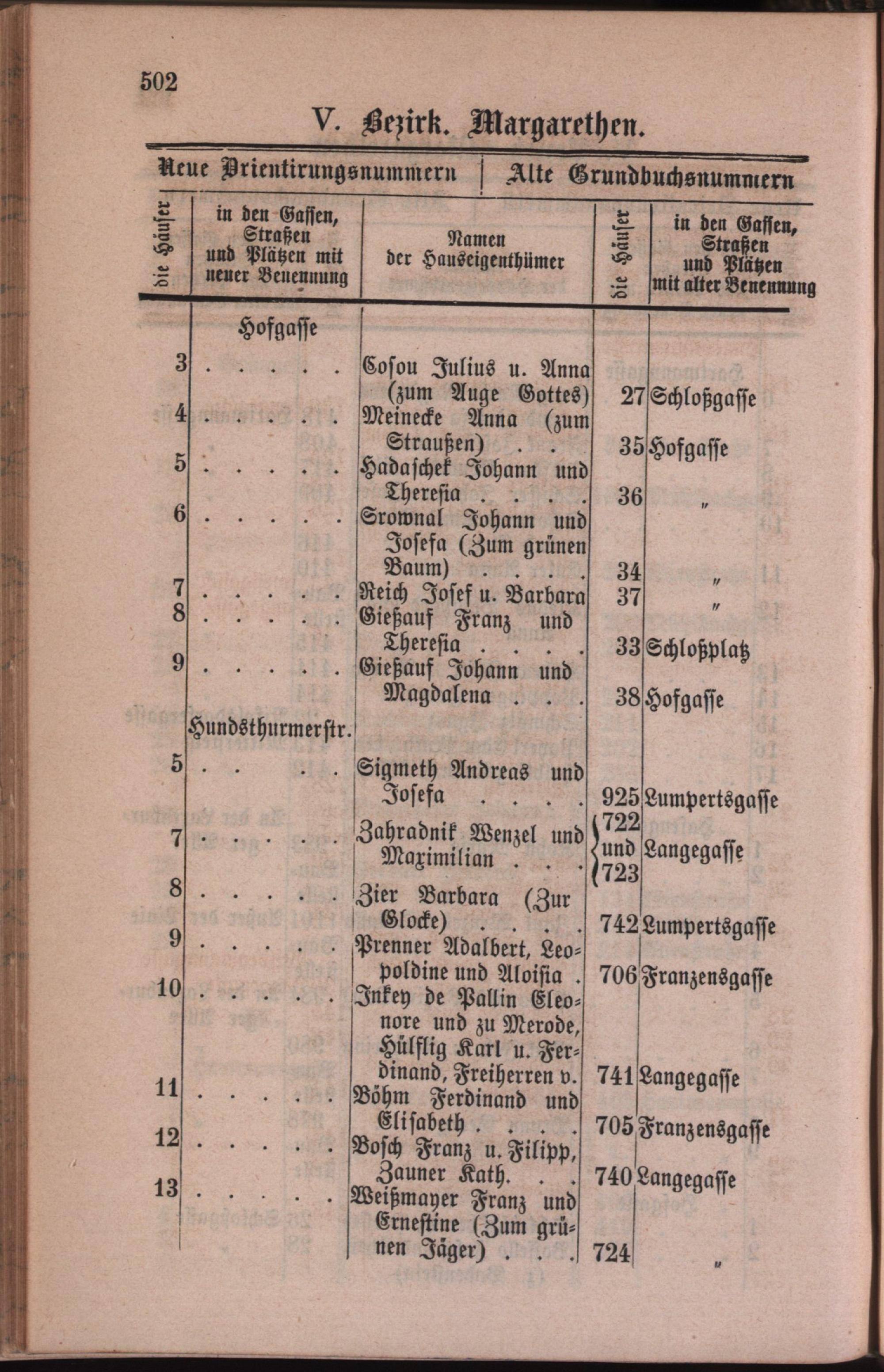 5: Margarethen : Nachweis der alten und neuen Benennungen der Gassen, Straßen und Plätze in alphabetischer Ordnung