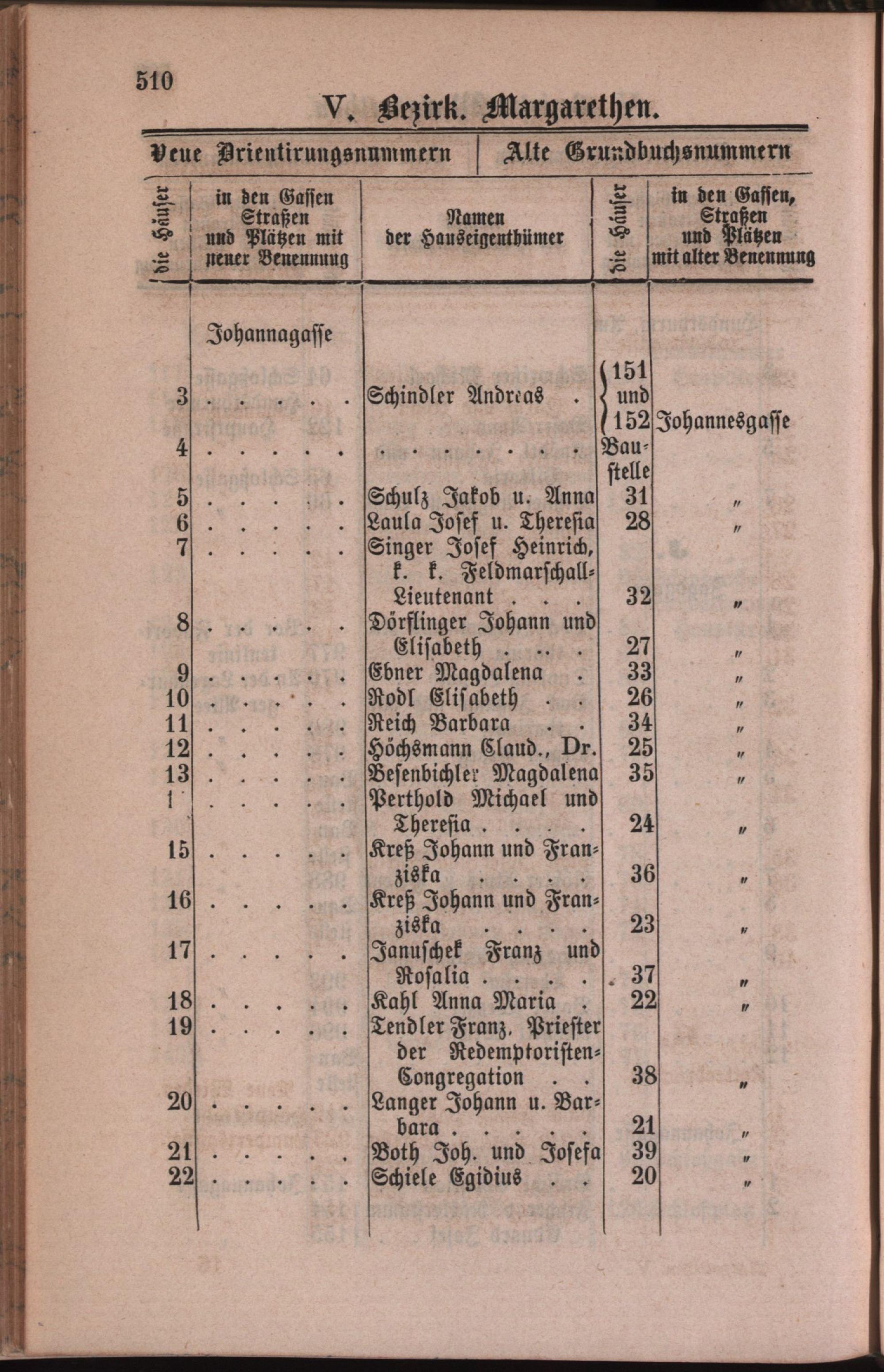 5: Margarethen : Nachweis der alten und neuen Benennungen der Gassen, Straßen und Plätze in alphabetischer Ordnung