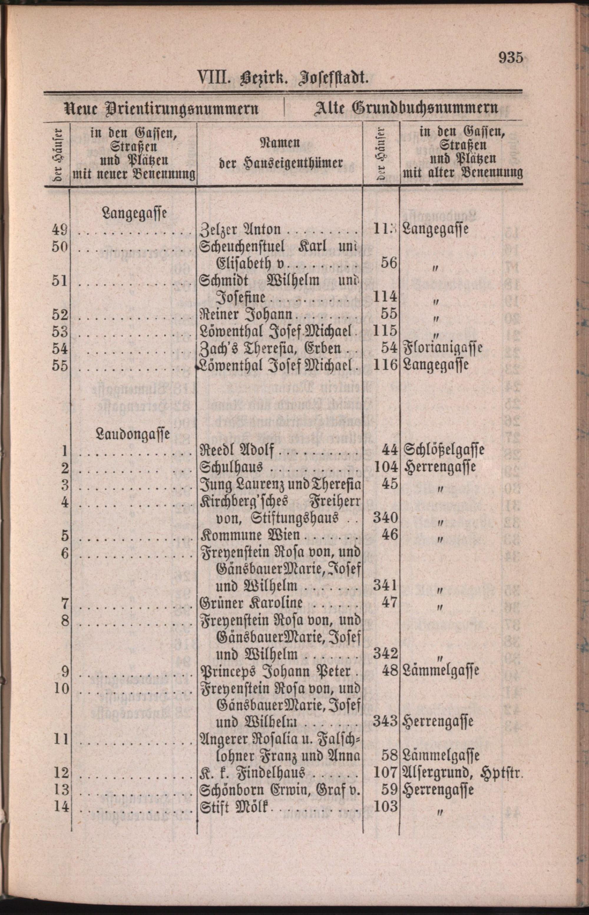 8: Josefstadt : Nachweis der alten und neuen Benennungen der Gassen, Straßen und Plätze in alphabetischer Ordnung