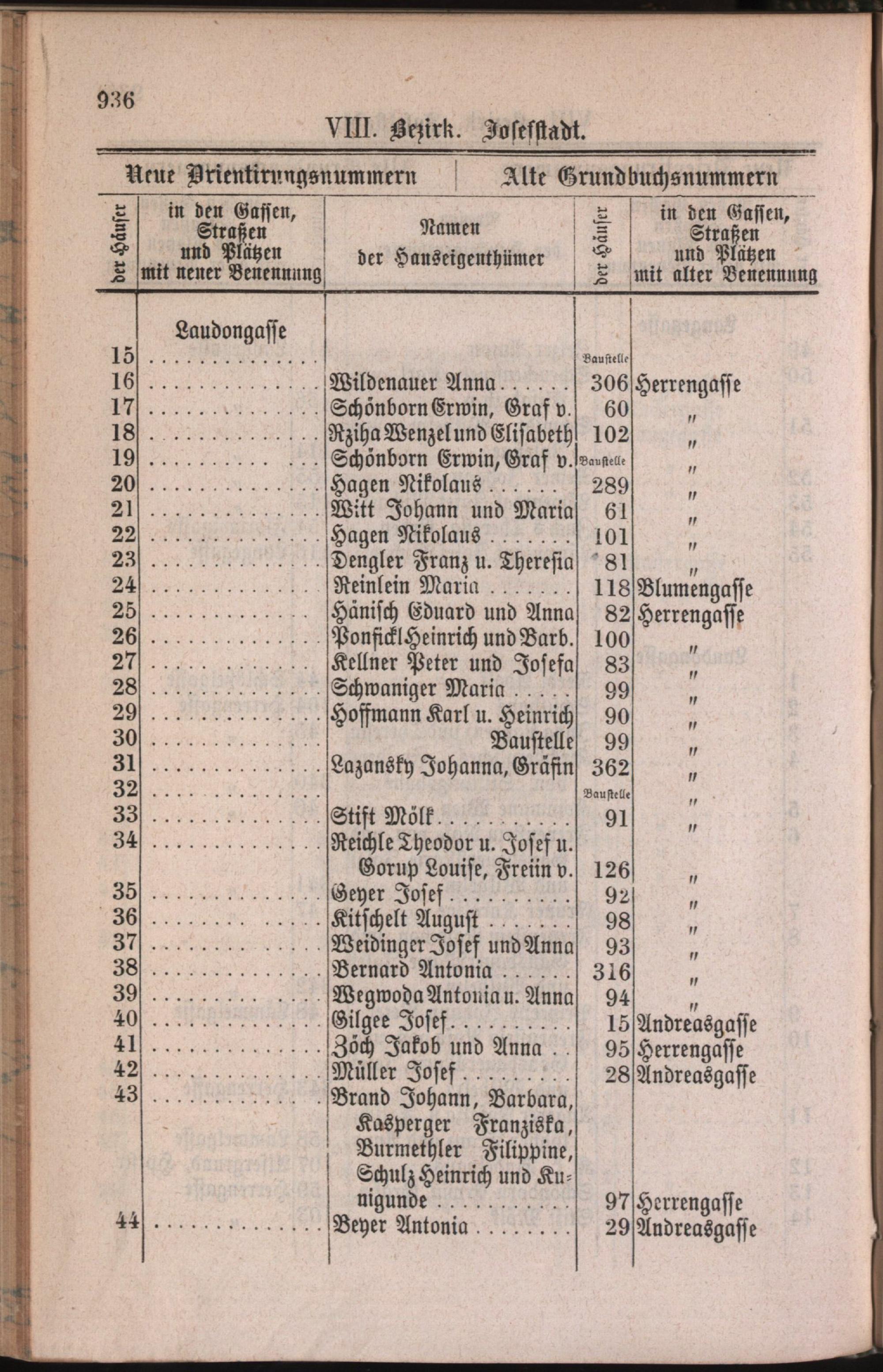 8: Josefstadt : Nachweis der alten und neuen Benennungen der Gassen, Straßen und Plätze in alphabetischer Ordnung