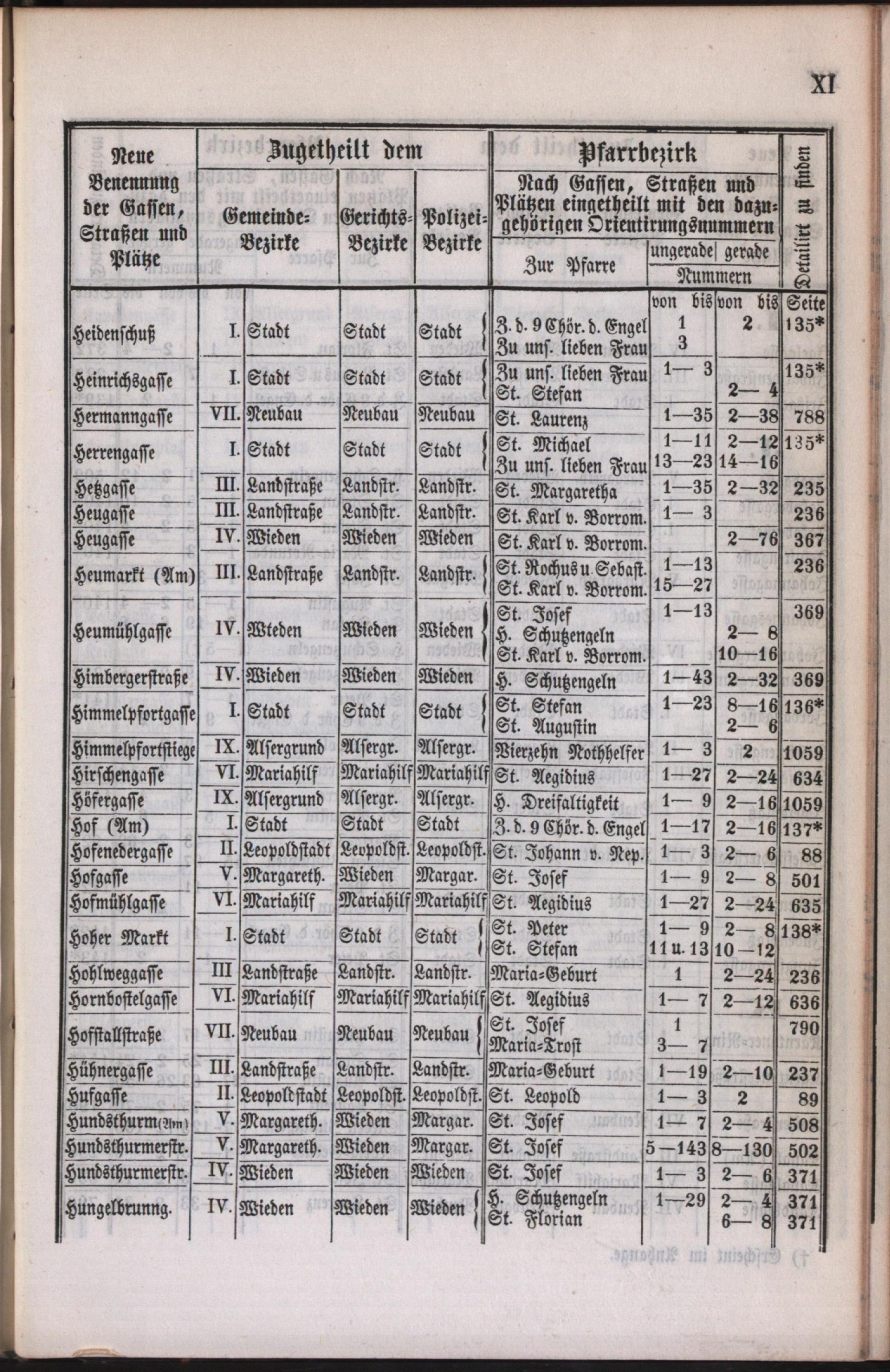 10 (1863) General-Index sämmtlicher Gassen-, Straßen- und Plätzenamen der, in neun Gemeinde-Bezirke eingetheilten, k.k. Reichshaupt- und Residenzstadt Wien : mit genauer Angabe der Gemeinde-, Gerichts-, Polizei- und Pfarrbezirke, nach Gassen, Straßen und Plätzen, mit den neuen Orientirungsnummern