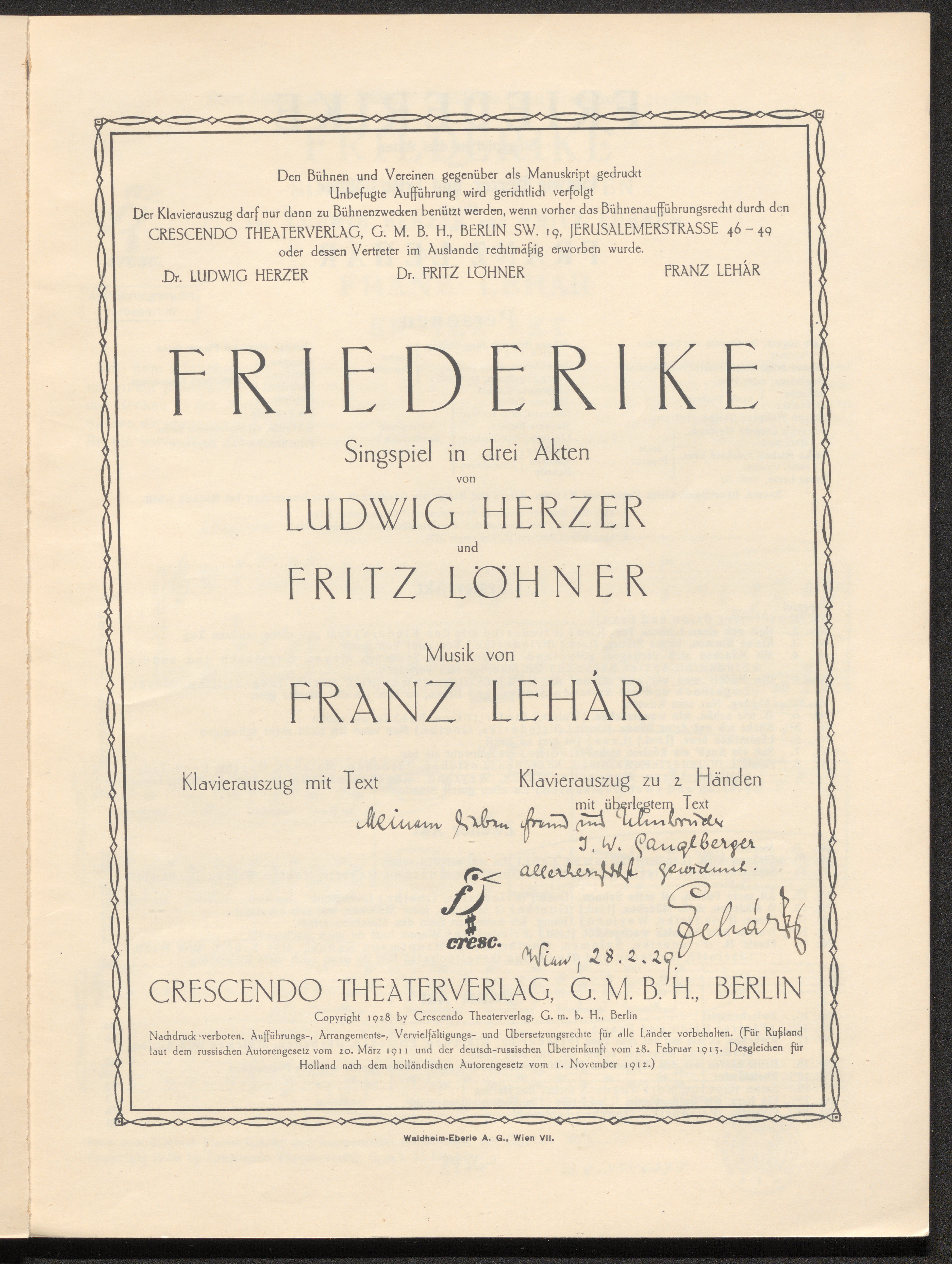 Friederike : Singspiel in drei Akten / Musik: Franz Lehár. Von Ludwig Herzer und Fritz Löhner