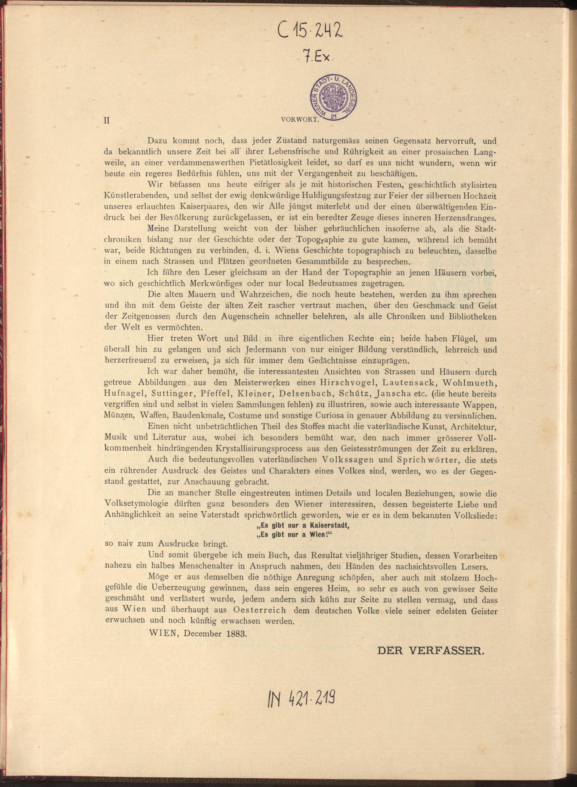 Die alten Strassen und Plaetze Wien's und ihre historisch interessanten Haeuser : ein Beitrag zur Culturgeschichte Wiens mit Rücksicht auf die vaterlændische Kunst, Architektur, Musik und Literatur / von Wilhelm Kisch