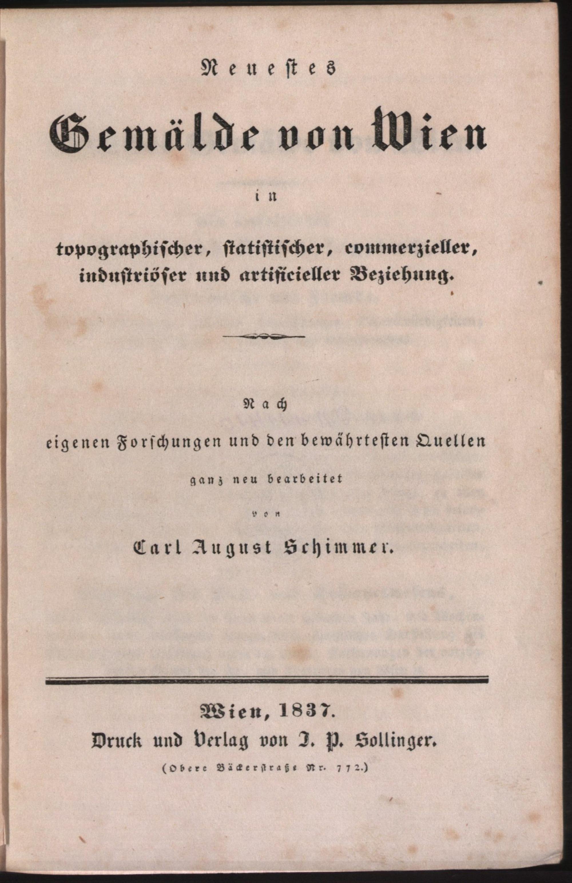 Neuestes Gemälde von Wien in topographischer, statistischer, commerzieller, industriöser und artificieller Beziehung / nach eig. Forschungen u. d. bewährtesten Quellen ganz neu bearb. von Carl August Schimmer
