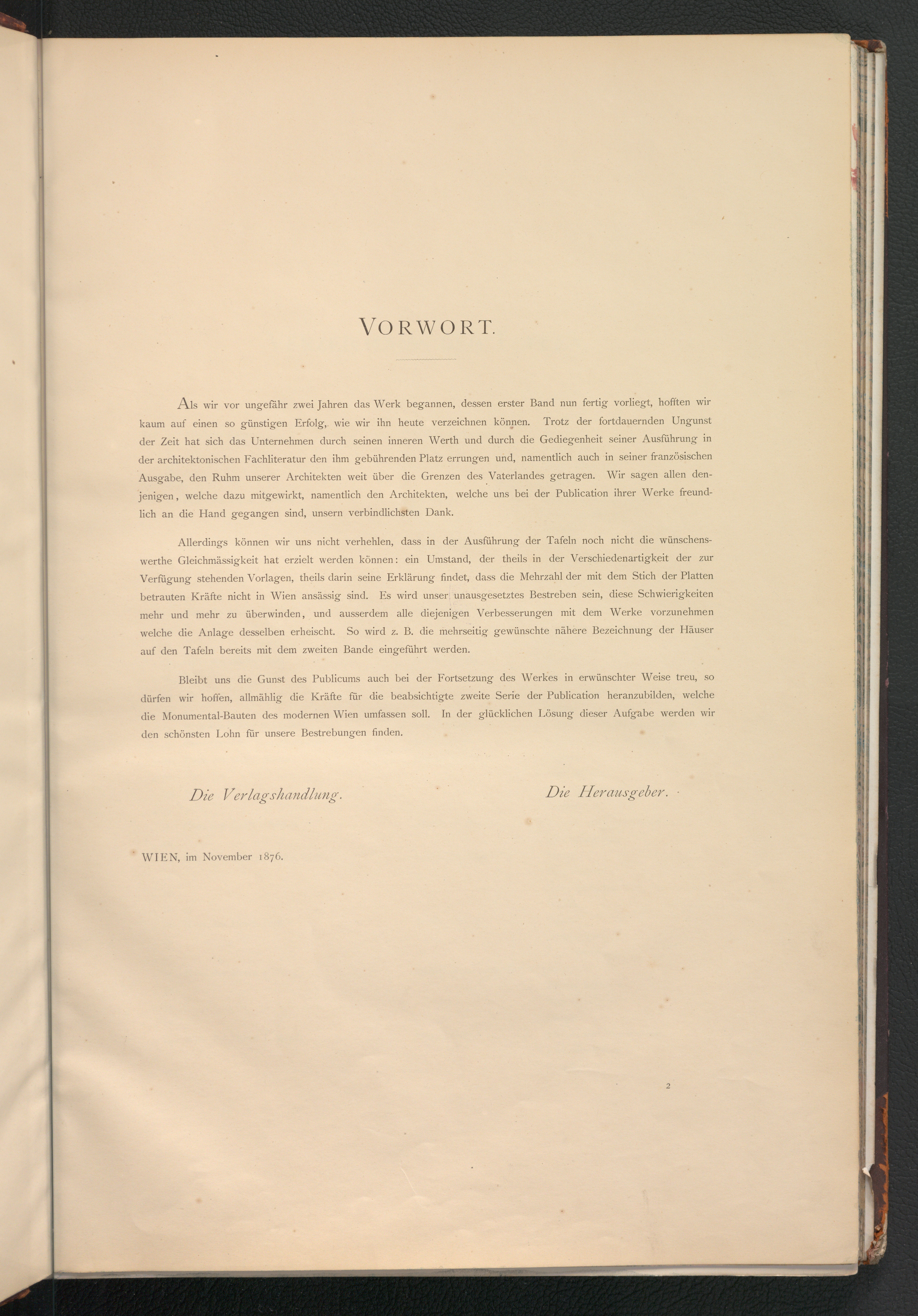 A,1 (1876) Wiener Neubauten / Hrsg. von Carl von Lützow und Ludwig Tischler. Unter Mitw. der Architekten: H. von Ferstel, E. & H. Förster, Th. von Hansen, Baron K. von Hasenauer ... . Gestochen unter der Leitung von Eduard Obermayer