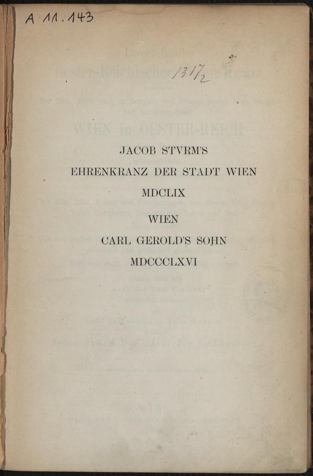 Unverwelklicher Oester-Reichischer Ehrenkranz gewunden der Röm. Kais. auch zu Ungarn und Böhmen königl. Majt. Haupt- und Residenz-Stadt Wien in Österreich an der Donau : in eigendlichster Historisch-Poetischer Beschreibung: gebunden mit aller Röm. Kaiser und Erz-Herzogen, aus diesem Haus Oester-Reich Gebuhrten, Regierungen, Leben und Tode ; darzu gefunden wie viel tapfere Helden durch den blutigen Teutschen Krieg rühmlich gekrieget und glükklich gesieget haben: und was mehr zu solchem von Nöhten gewesen ; dieses alles hat nach der Zeit Verlauf ordentlich verfasset und mit nothwendigen Anmerkungen erkläret / Jacob Sturm