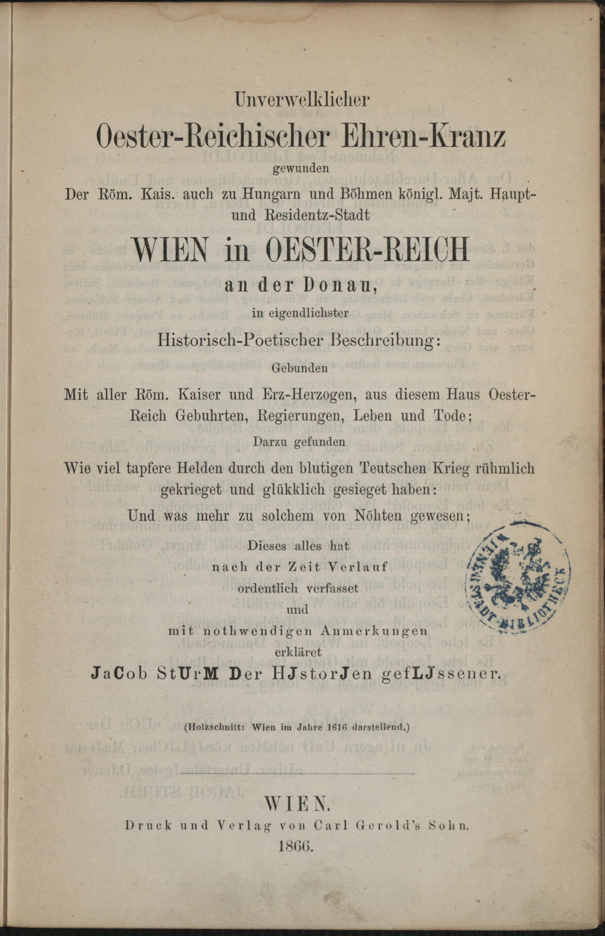 Unverwelklicher Oester-Reichischer Ehrenkranz gewunden der Röm. Kais. auch zu Ungarn und Böhmen königl. Majt. Haupt- und Residenz-Stadt Wien in Österreich an der Donau : in eigendlichster Historisch-Poetischer Beschreibung: gebunden mit aller Röm. Kaiser und Erz-Herzogen, aus diesem Haus Oester-Reich Gebuhrten, Regierungen, Leben und Tode ; darzu gefunden wie viel tapfere Helden durch den blutigen Teutschen Krieg rühmlich gekrieget und glükklich gesieget haben: und was mehr zu solchem von Nöhten gewesen ; dieses alles hat nach der Zeit Verlauf ordentlich verfasset und mit nothwendigen Anmerkungen erkläret / Jacob Sturm