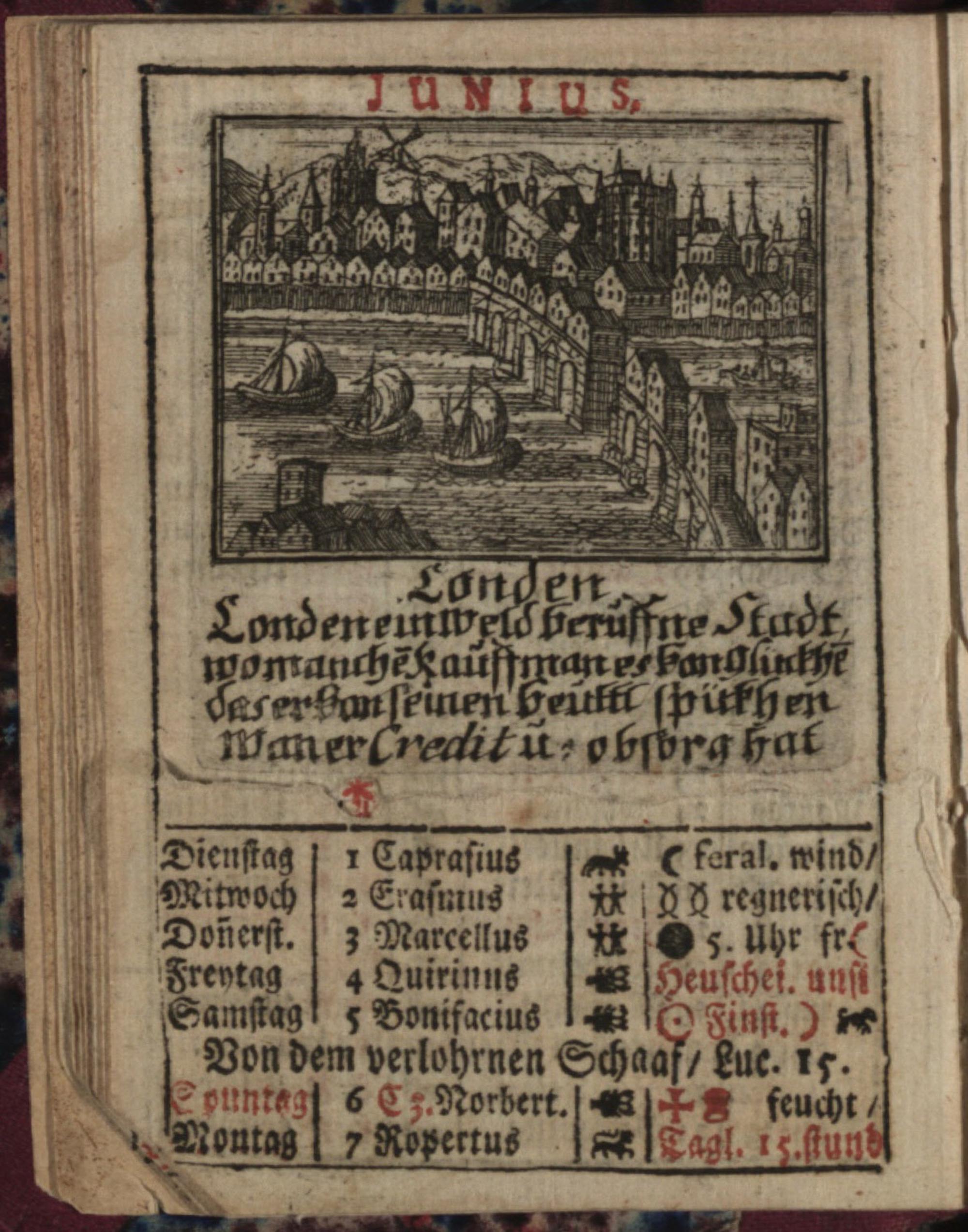 Neuer Hand-Calender Auf das Jahr 1723 : In welchen zu ersehen, wer unter dem Burgerl. Herren Handels-Stand incorporirt, und wo sie ihre Gewölber und Schild haben ; Dann auch welche herrn hiervon voriges Jahr gestorben, beynebens was von einem Saeculo her als 1617. biß auf gegenwärtiges Jahr als ältiste Herrn Vorsteher von dem gesamten Burgerl. Handels-Stand von Jahr zu Jahr verordnet worden seyn ; Item die in drey Classen ernennte Sensal-Bottenschaffter, und Güter-Bestäter ; Die Nahmen deren Häusern, wo die außländische Botten ihre Einkehr machen, sambt Post-Ordnung und Stadt-Sperr / Einem Wiennerisch-Burgerlichen Handels-Stand zum Neuen Jahr offerirt durch Johann Georg Prax, als der Zeit bestellter Ansager