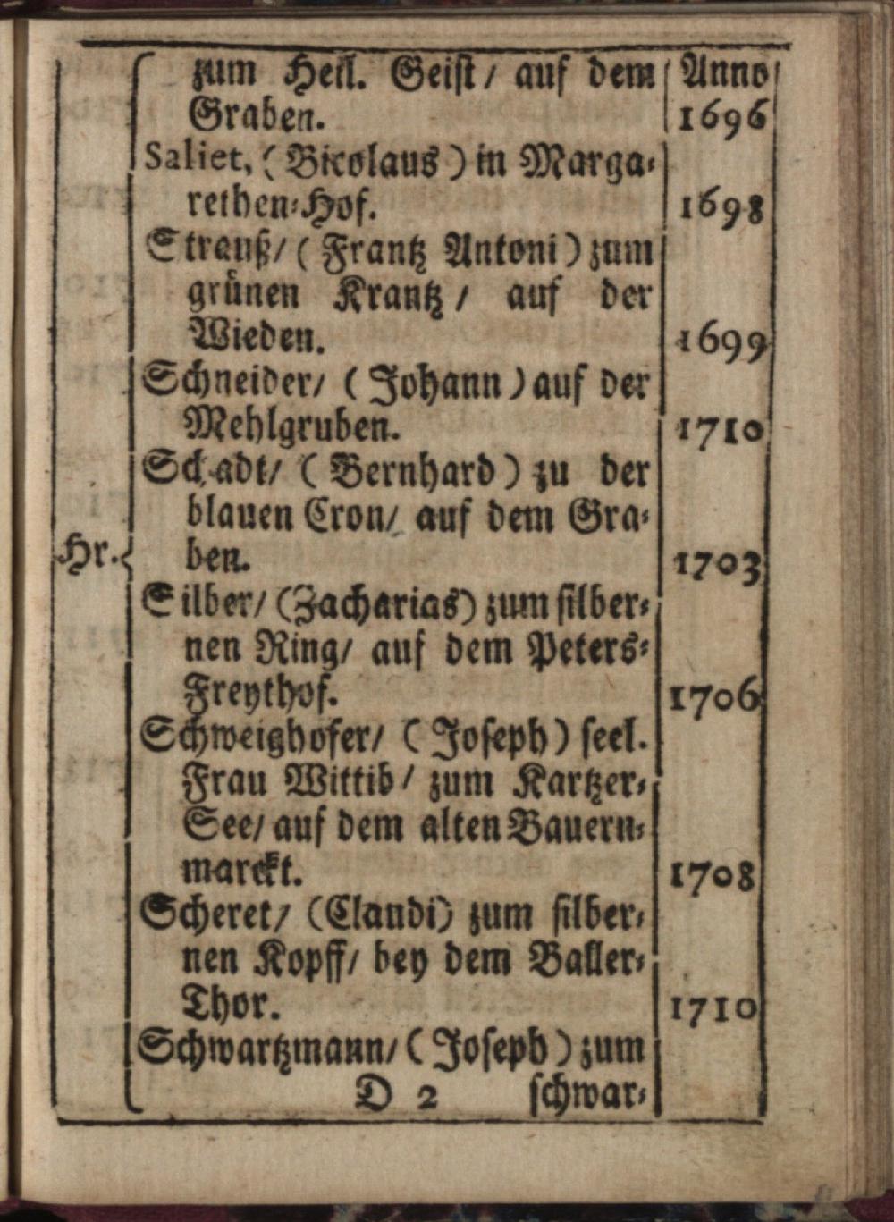 Neuer Hand-Calender Auf das Jahr 1723 : In welchen zu ersehen, wer unter dem Burgerl. Herren Handels-Stand incorporirt, und wo sie ihre Gewölber und Schild haben ; Dann auch welche herrn hiervon voriges Jahr gestorben, beynebens was von einem Saeculo her als 1617. biß auf gegenwärtiges Jahr als ältiste Herrn Vorsteher von dem gesamten Burgerl. Handels-Stand von Jahr zu Jahr verordnet worden seyn ; Item die in drey Classen ernennte Sensal-Bottenschaffter, und Güter-Bestäter ; Die Nahmen deren Häusern, wo die außländische Botten ihre Einkehr machen, sambt Post-Ordnung und Stadt-Sperr / Einem Wiennerisch-Burgerlichen Handels-Stand zum Neuen Jahr offerirt durch Johann Georg Prax, als der Zeit bestellter Ansager