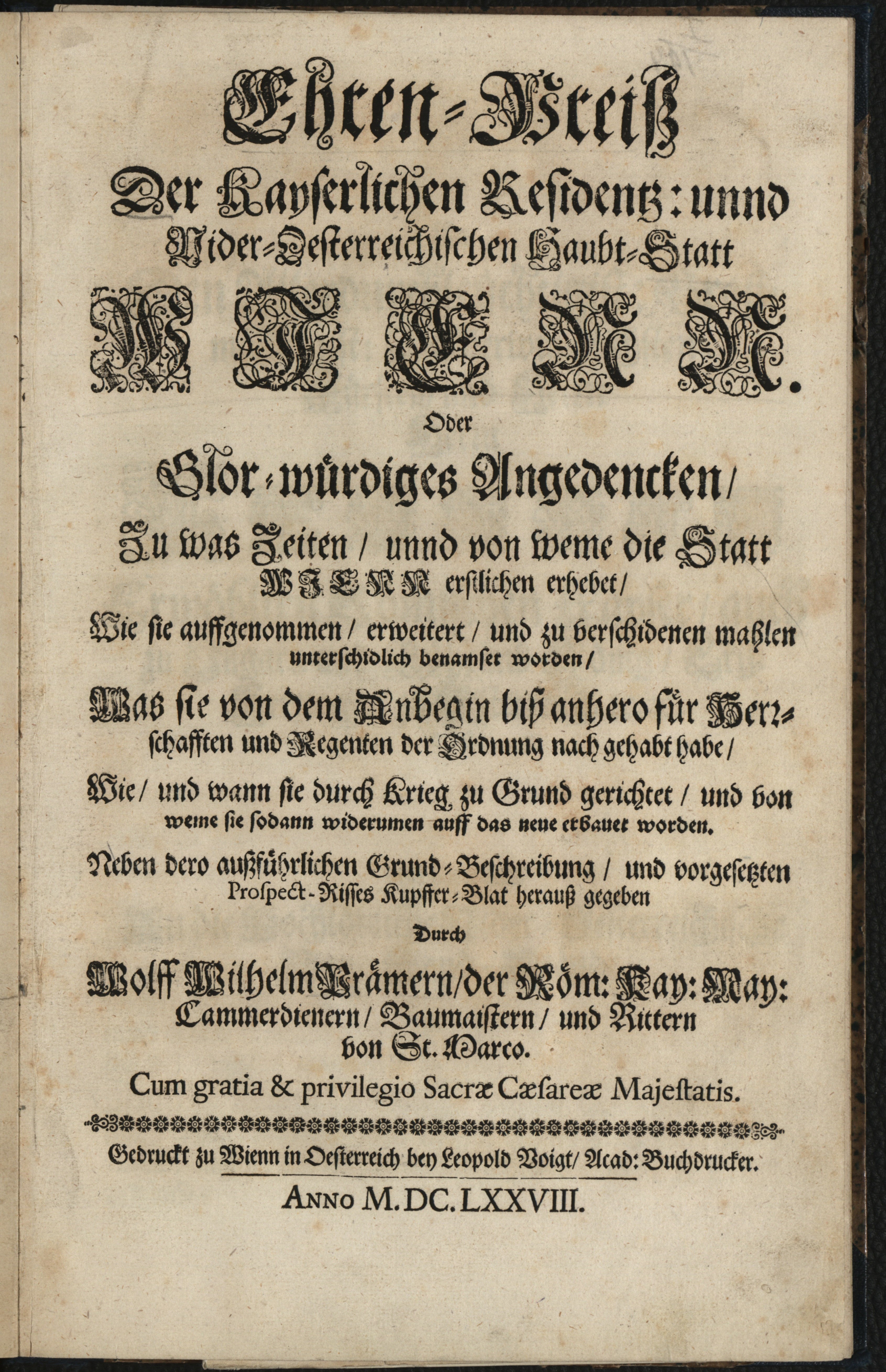 Ehren-Preiß Der Kayserlichen Residentz- unnd Nider-Oesterreichischen Haubt-Statt Wienn. Oder Glor-würdiges Angedencken, Zu was Zeiten, unnd von weme die Statt Wienn erstlichen erhebet, Wie sie auffgenommen, erweitert, und zu verschidenen mahlen unterschidlich benamset worden, Was sie von dem Anbegin biß anhero für Herrschafften und Regenten der Ordnung nach gehabt habe, Wie, und wann sie durch Krieg zu Grund gerichtet, und von weme sie sodann widerumen auff das neue erbauet worden : Neben dero außführlichen Grund-Beschreibung, und vergesetzten Prospect-Risses Kupffer-Blat / herauß gegeben durch Wolff Wilhelm Prämer, der Röm. Kay. May. Cammerdienern, Baumaistern, und Rittern von St. Marco