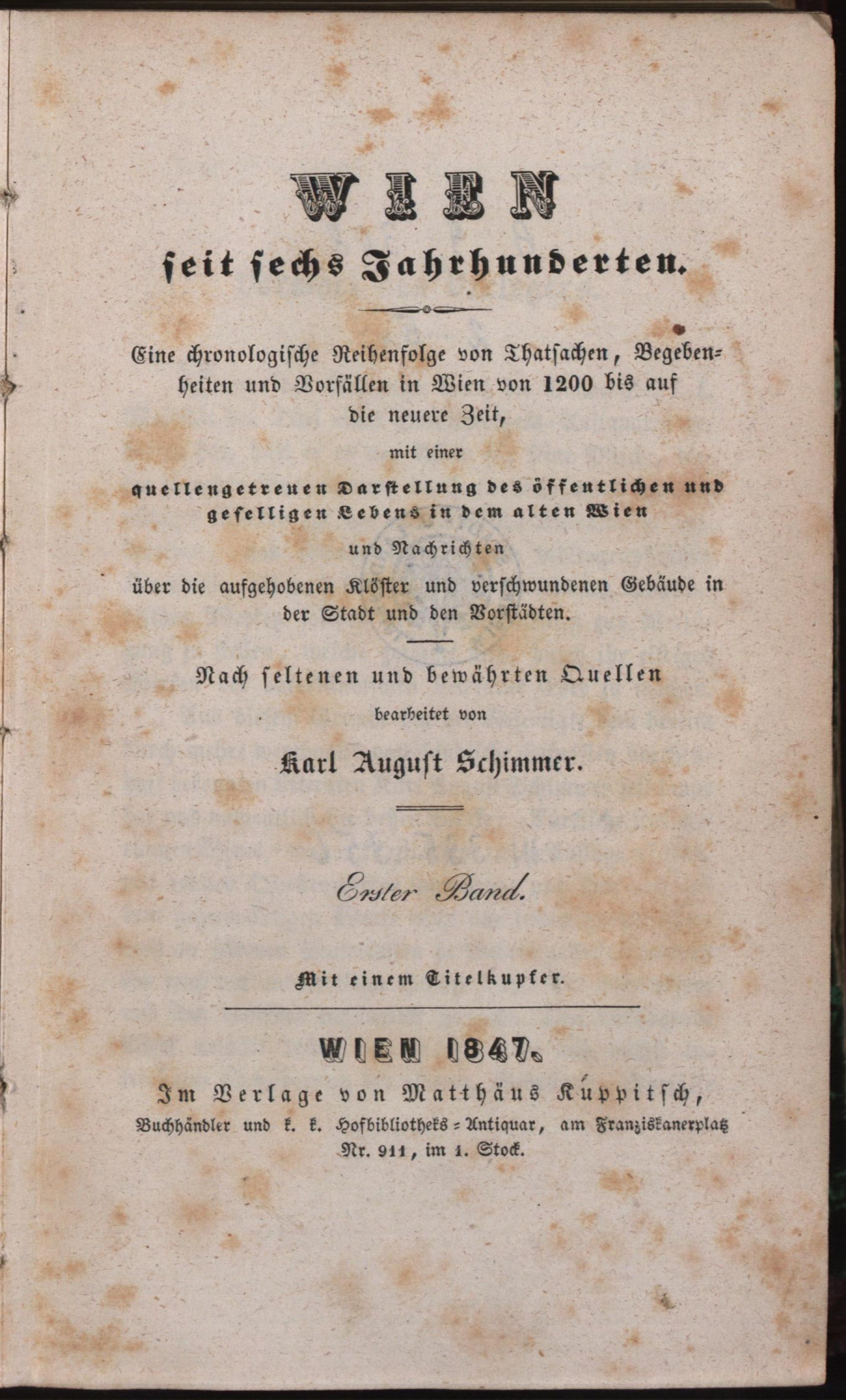 1 (1847) Wien seit sechs Jahrhunderten : Eine chronologische Reihenfolge von Thatsachen, Begebenheiten und Vorfällen in Wien von 1200 bis auf die neuere Zeit ; mit einer quellengetreuen Darstellung des öffentlichen und geselligen Lebens in dem alten Wien und Nachrichten über die aufgehobenen Klöster und verschwundenen Gebäude in der Stadt und den Vorstädten ; Nach seltenen und bewährten Quellen / bearbeitet von Karl August Schimmer