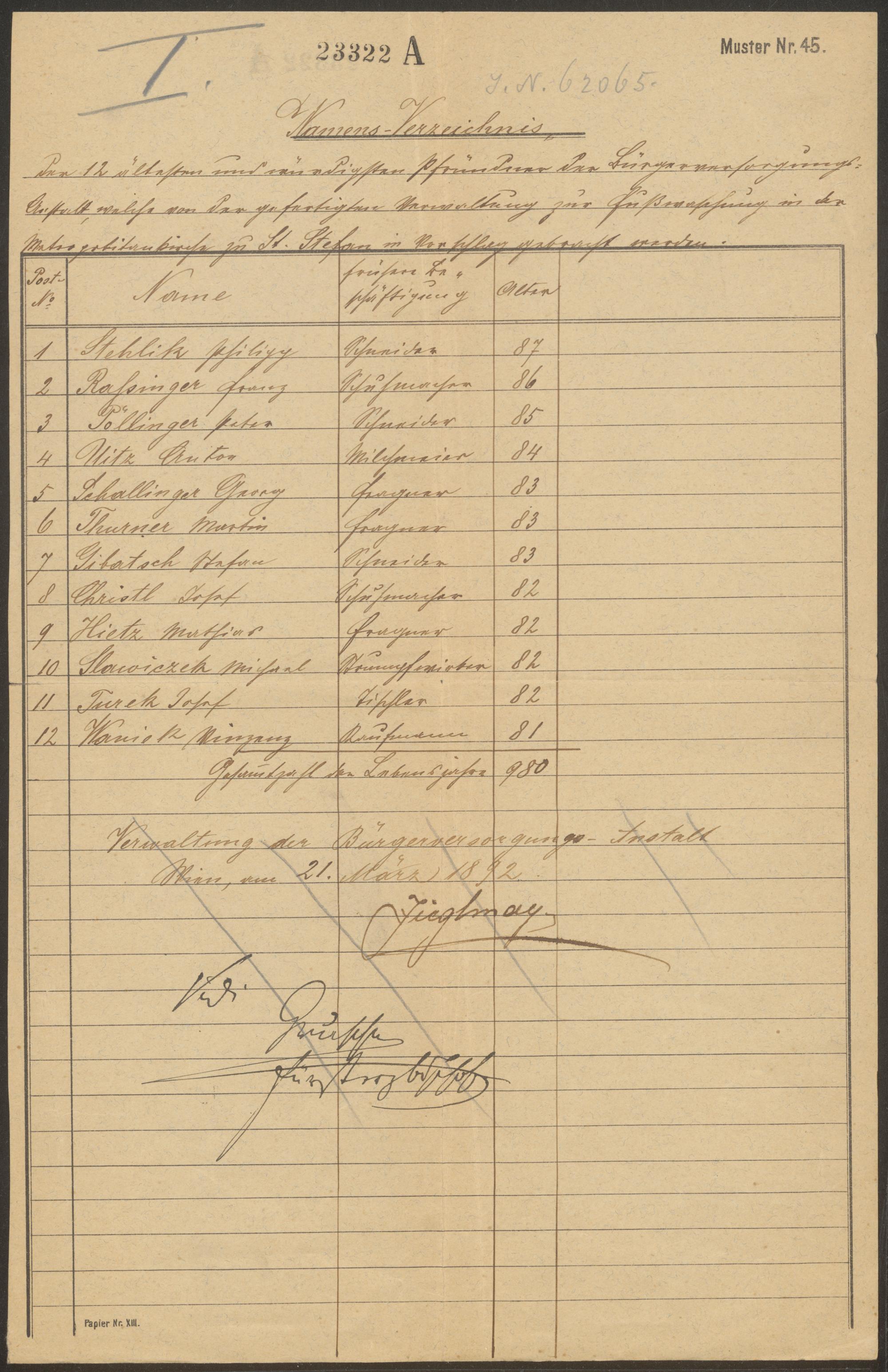 Namens-Verzeichnis der 12 ältesten und würdigsten Pfründner der Bürgerversorgungs-Anstalt, welche von der gefertigten Verwaltung zur Fußwaschung in der Metropolitankirche zu St. Stefan in Vorschlag gebracht werden : Wien, am 21. März 1892 / Verwaltung der Bürgerversorgungs-Anstalt, Zieglmay.