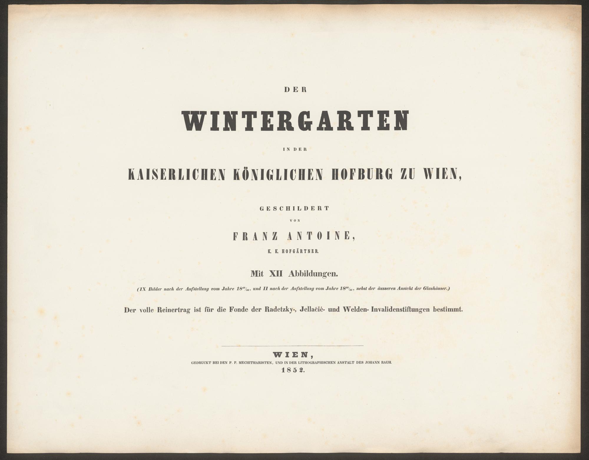 Der Wintergarten in der kaiserlich königlichen Hofburg zu Wien : Mit XII Abbildungen ; IX Bilder nach der Aufstellung vom Jahre 1849/50 und II nach der Aufstellung vom Jahre 1850/51, nebst der äusseren Ansicht der Glashäuser / geschildert von Franz Antoine