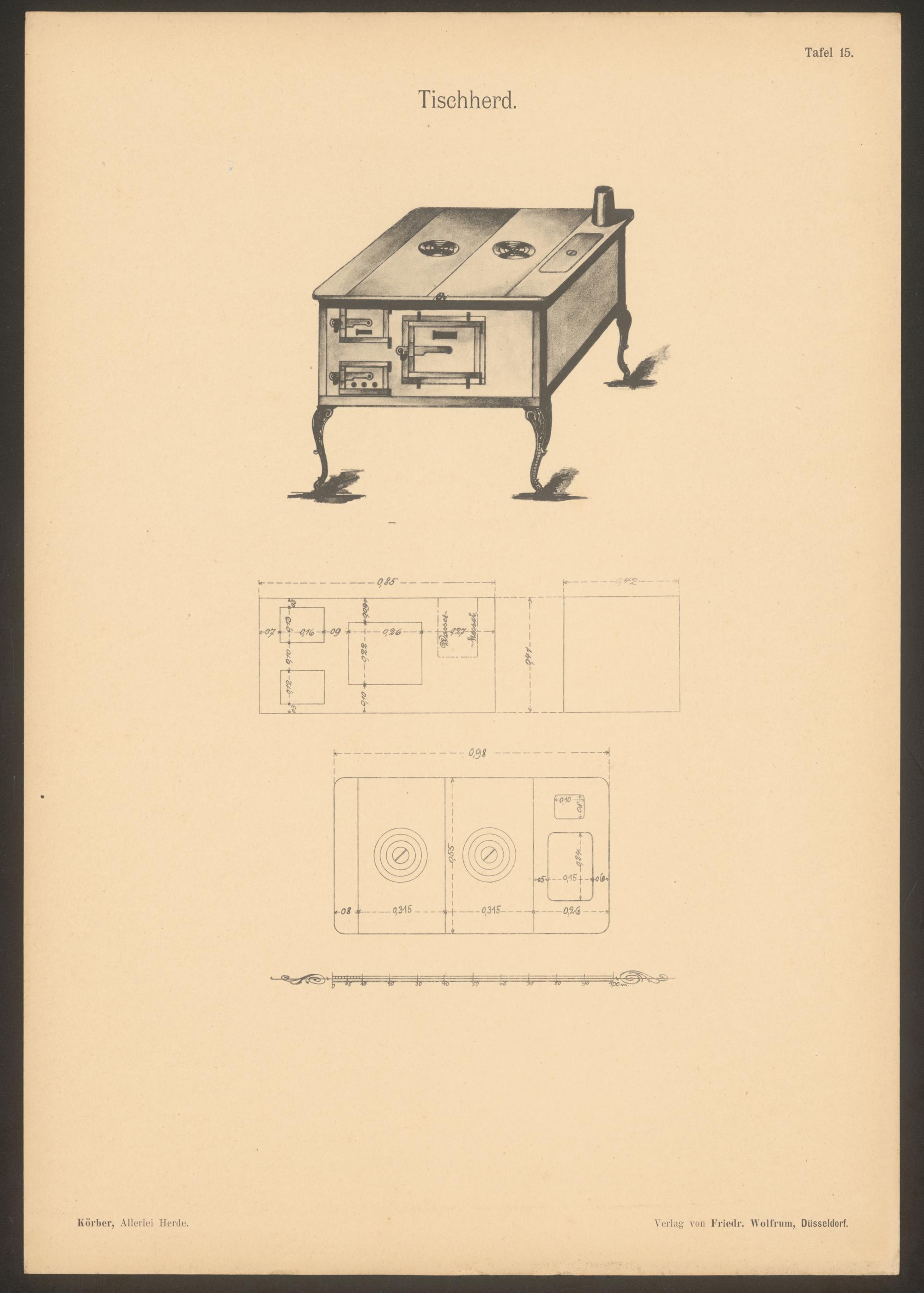Allerlei Herde : Original-Entwürfe von Tischherden, Aufsatzherden, Herden für Gasthäuser, Krankenhäuser etc., Kaffeehausherden, Backöfen für Konditoreien, Windöfen, Grilliermaschinen, Leimwärmeöfen etc. ; mit Mass- und Preisangaben ; 53 Tafeln mit kurzem beschreibenden Text / hrsg. von Leonhard Körber