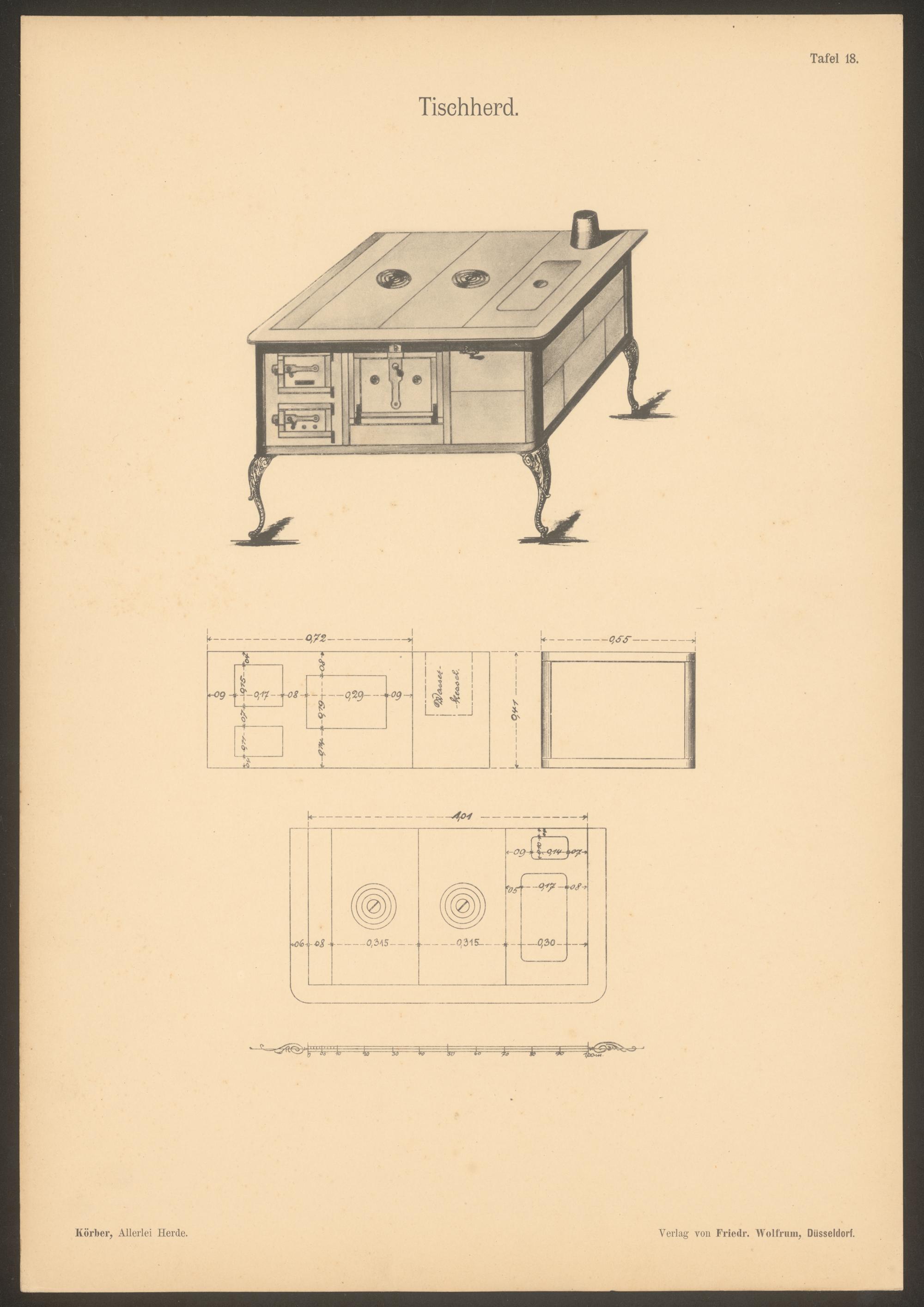 Allerlei Herde : Original-Entwürfe von Tischherden, Aufsatzherden, Herden für Gasthäuser, Krankenhäuser etc., Kaffeehausherden, Backöfen für Konditoreien, Windöfen, Grilliermaschinen, Leimwärmeöfen etc. ; mit Mass- und Preisangaben ; 53 Tafeln mit kurzem beschreibenden Text / hrsg. von Leonhard Körber