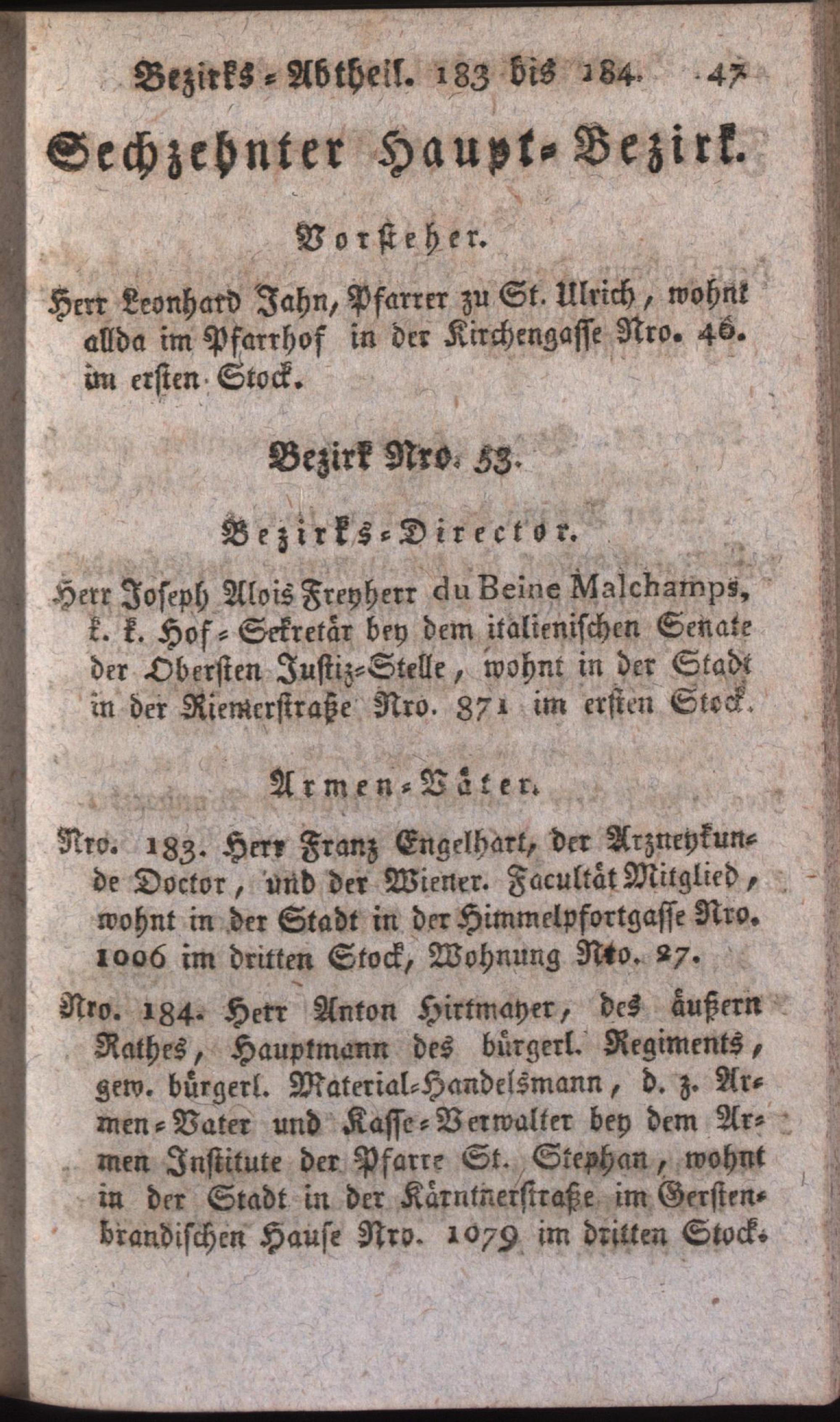 Schematismus zum Behufe der von Seiner k. k. Apostolischen Majestät angeordneten allgemeinen Untersuchung aller Armen in dem ganzen Umfange des Wiener-Armen-Institutes / hrsg. auf Veranlassung der k. k. Hofcommission zu Regulirung der Wohlthätigkeits-Anstalten