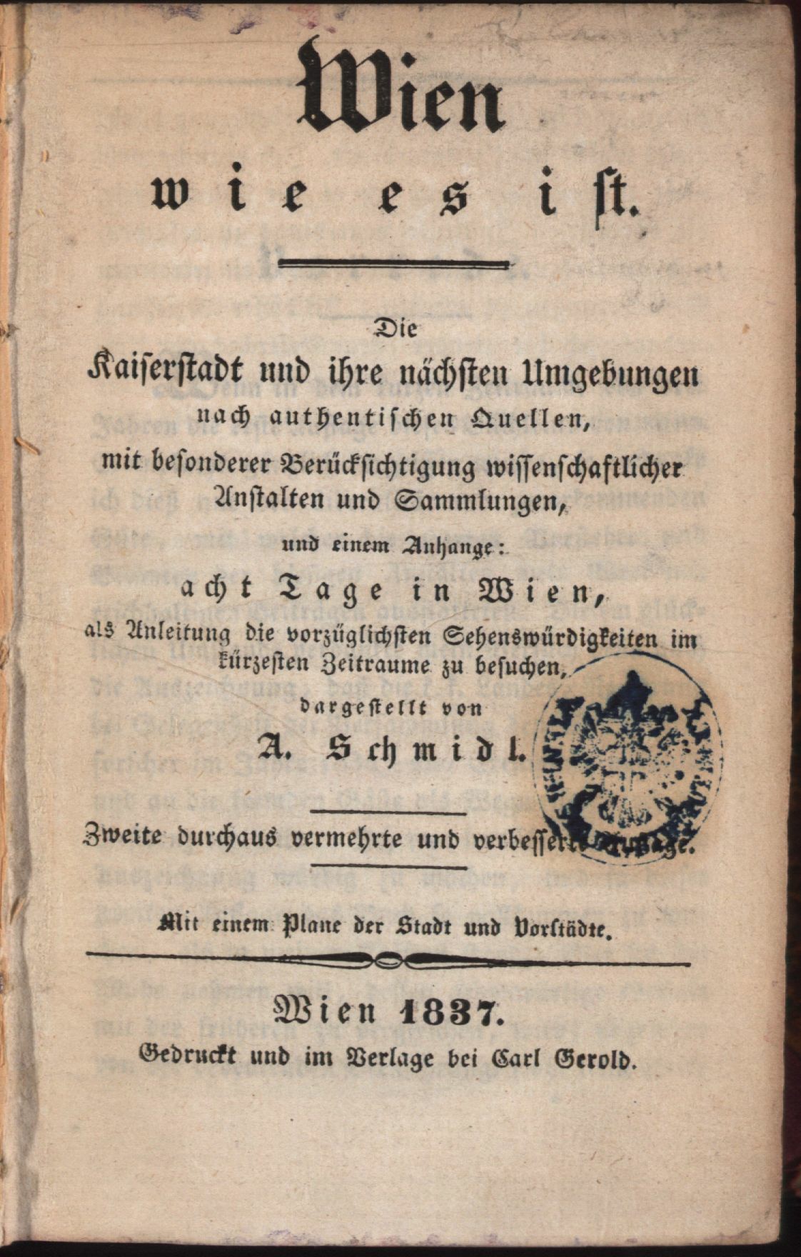 Wien wie es ist : Die Kaiserstadt und ihre nächsten Umgebungen ; nach authentischen Quellen, mit besonderer Berücksichtigung wissenschaftlicher Anstalten und Sammlungen, und einem Anhange: acht Tage in Wien, als Anleitung die vorzüglichsten Sehenswürdigkeiten im kürzesten Zeitraume zu besuchen ; Mit einem Plane der Stadt und Vorstädte / dargest. von A. Schmidl