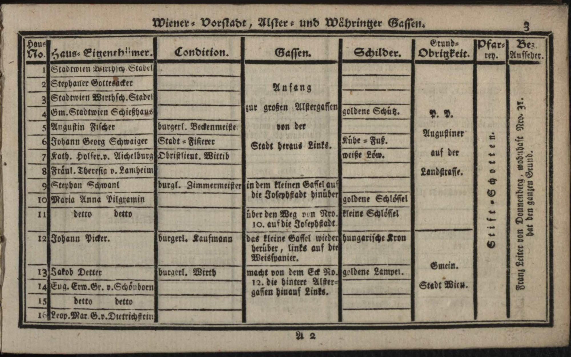 Verzeichniß der in der Kaiserl. Königl. Haupt- und Residenzstadt Wien, sammt dazu gehörigen Vorstädten, und Gründen, befindlichen numerirten Häusern derselben Eigenthümern, und deren Conditionen, Schilderen, Gassen, Grund-Obrigkeiten, Pfarreyen, und derzeit Bezirksaufsehern : auf das genaueste nach denen Grundbüchern entworfen / Von Franz de Ponty