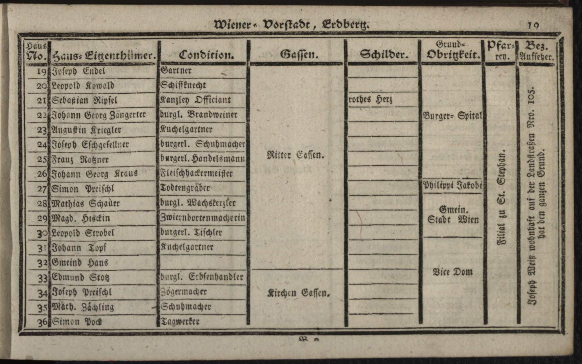Verzeichniß der in der Kaiserl. Königl. Haupt- und Residenzstadt Wien, sammt dazu gehörigen Vorstädten, und Gründen, befindlichen numerirten Häusern derselben Eigenthümern, und deren Conditionen, Schilderen, Gassen, Grund-Obrigkeiten, Pfarreyen, und derzeit Bezirksaufsehern : auf das genaueste nach denen Grundbüchern entworfen / Von Franz de Ponty