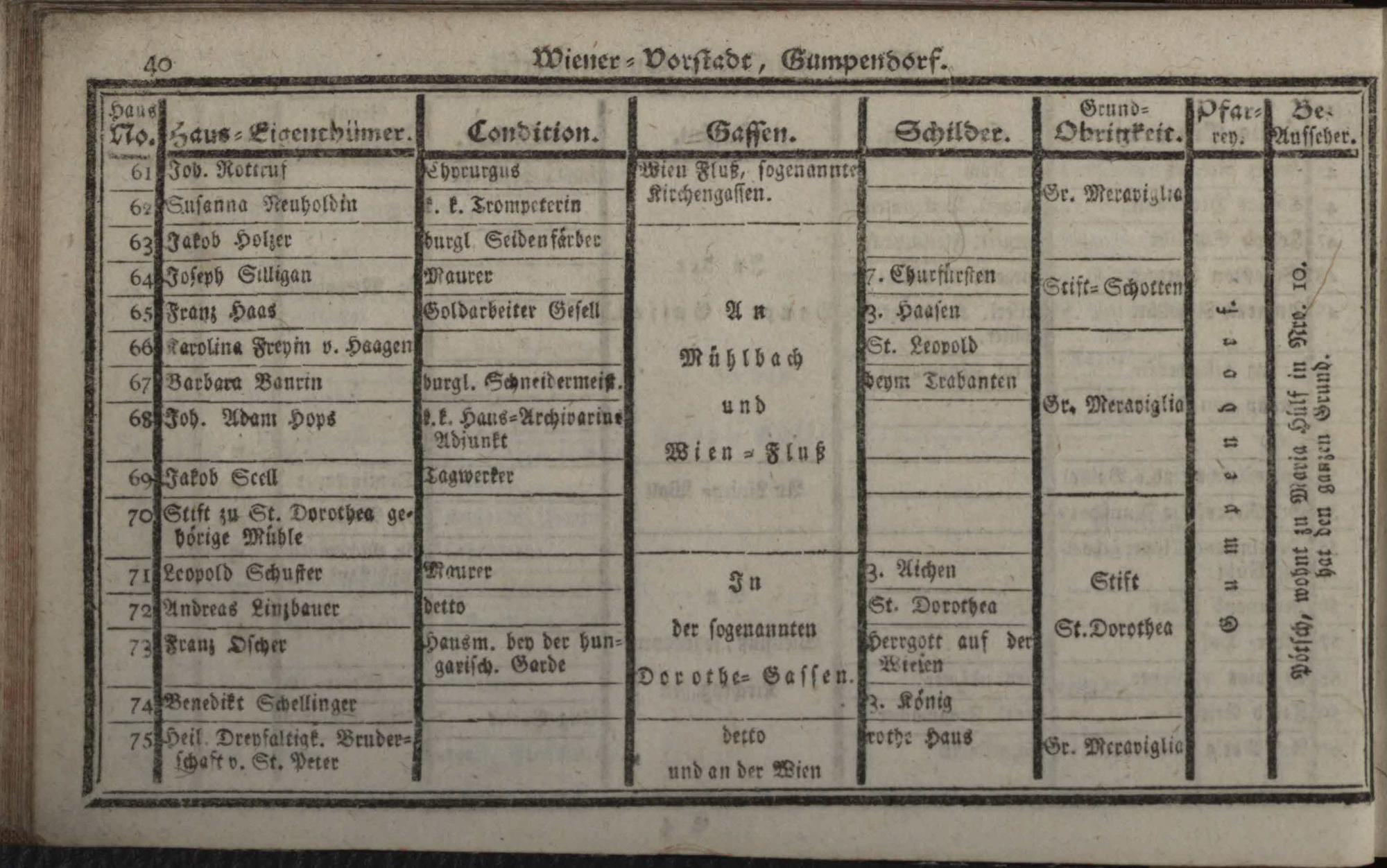 Verzeichniß der in der Kaiserl. Königl. Haupt- und Residenzstadt Wien, sammt dazu gehörigen Vorstädten, und Gründen, befindlichen numerirten Häusern derselben Eigenthümern, und deren Conditionen, Schilderen, Gassen, Grund-Obrigkeiten, Pfarreyen, und derzeit Bezirksaufsehern : auf das genaueste nach denen Grundbüchern entworfen / Von Franz de Ponty