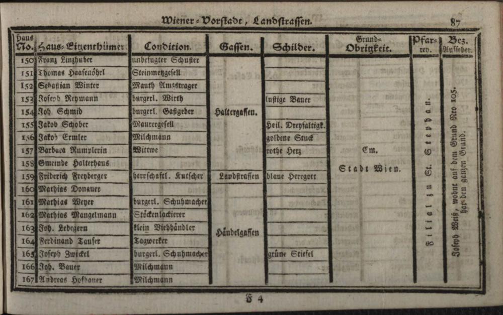 Verzeichniß der in der Kaiserl. Königl. Haupt- und Residenzstadt Wien, sammt dazu gehörigen Vorstädten, und Gründen, befindlichen numerirten Häusern derselben Eigenthümern, und deren Conditionen, Schilderen, Gassen, Grund-Obrigkeiten, Pfarreyen, und derzeit Bezirksaufsehern : auf das genaueste nach denen Grundbüchern entworfen / Von Franz de Ponty