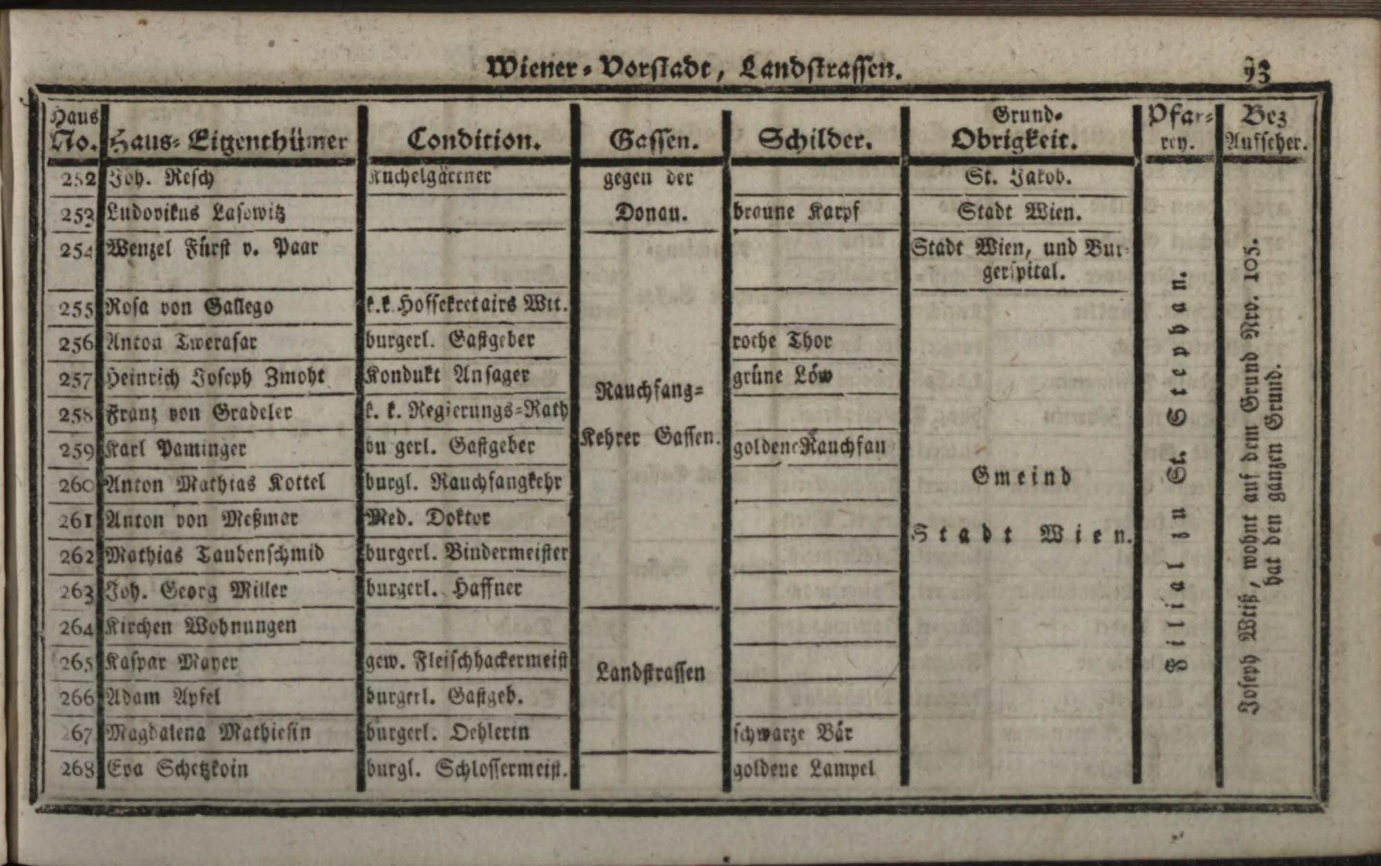 Verzeichniß der in der Kaiserl. Königl. Haupt- und Residenzstadt Wien, sammt dazu gehörigen Vorstädten, und Gründen, befindlichen numerirten Häusern derselben Eigenthümern, und deren Conditionen, Schilderen, Gassen, Grund-Obrigkeiten, Pfarreyen, und derzeit Bezirksaufsehern : auf das genaueste nach denen Grundbüchern entworfen / Von Franz de Ponty