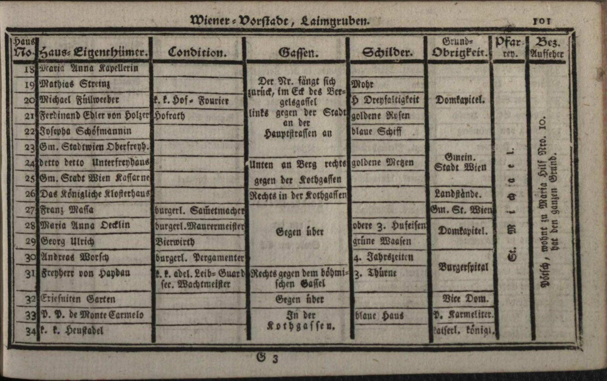 Verzeichniß der in der Kaiserl. Königl. Haupt- und Residenzstadt Wien, sammt dazu gehörigen Vorstädten, und Gründen, befindlichen numerirten Häusern derselben Eigenthümern, und deren Conditionen, Schilderen, Gassen, Grund-Obrigkeiten, Pfarreyen, und derzeit Bezirksaufsehern : auf das genaueste nach denen Grundbüchern entworfen / Von Franz de Ponty