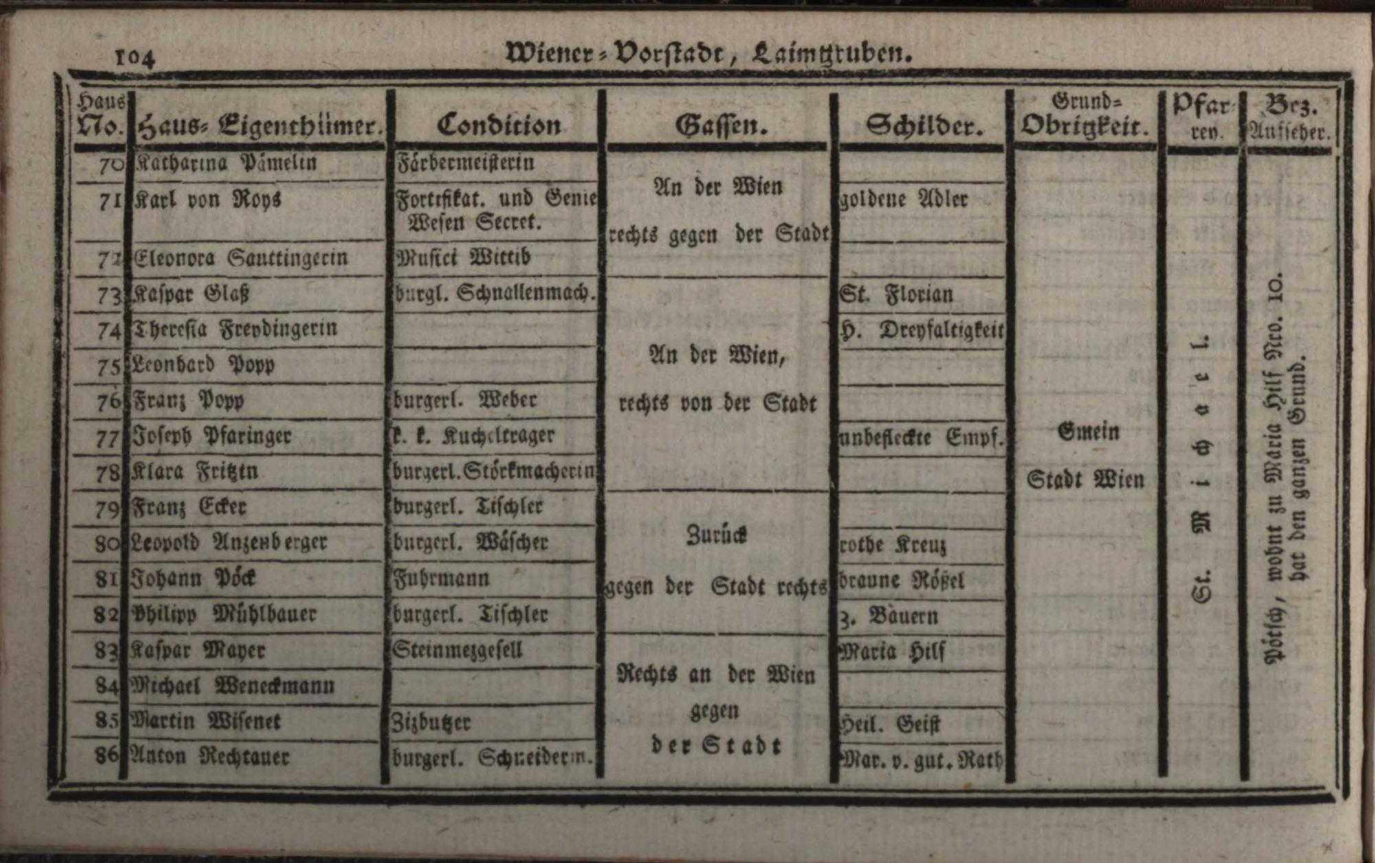 Verzeichniß der in der Kaiserl. Königl. Haupt- und Residenzstadt Wien, sammt dazu gehörigen Vorstädten, und Gründen, befindlichen numerirten Häusern derselben Eigenthümern, und deren Conditionen, Schilderen, Gassen, Grund-Obrigkeiten, Pfarreyen, und derzeit Bezirksaufsehern : auf das genaueste nach denen Grundbüchern entworfen / Von Franz de Ponty