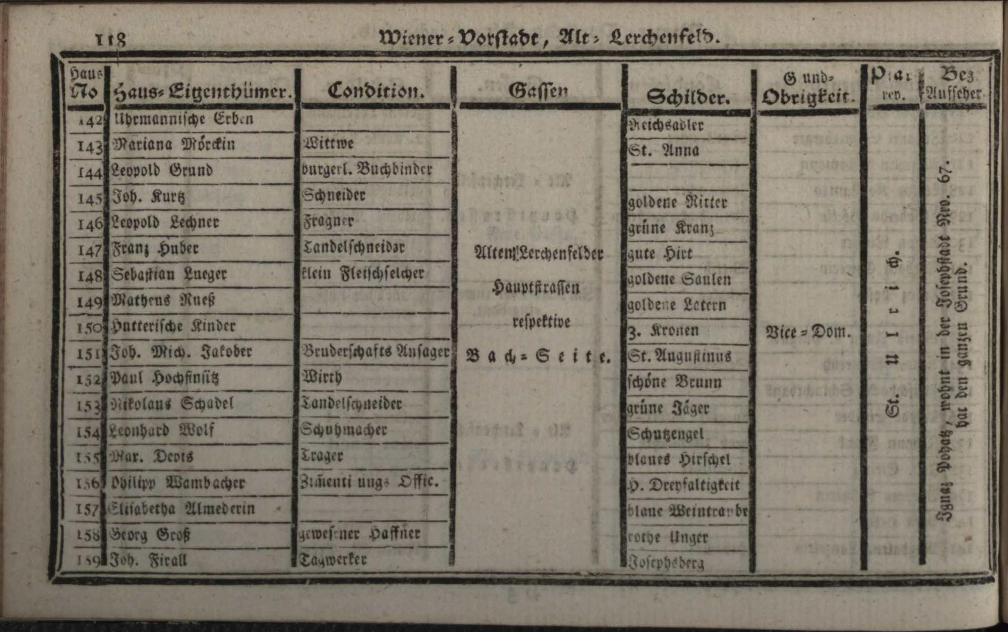 Verzeichniß der in der Kaiserl. Königl. Haupt- und Residenzstadt Wien, sammt dazu gehörigen Vorstädten, und Gründen, befindlichen numerirten Häusern derselben Eigenthümern, und deren Conditionen, Schilderen, Gassen, Grund-Obrigkeiten, Pfarreyen, und derzeit Bezirksaufsehern : auf das genaueste nach denen Grundbüchern entworfen / Von Franz de Ponty