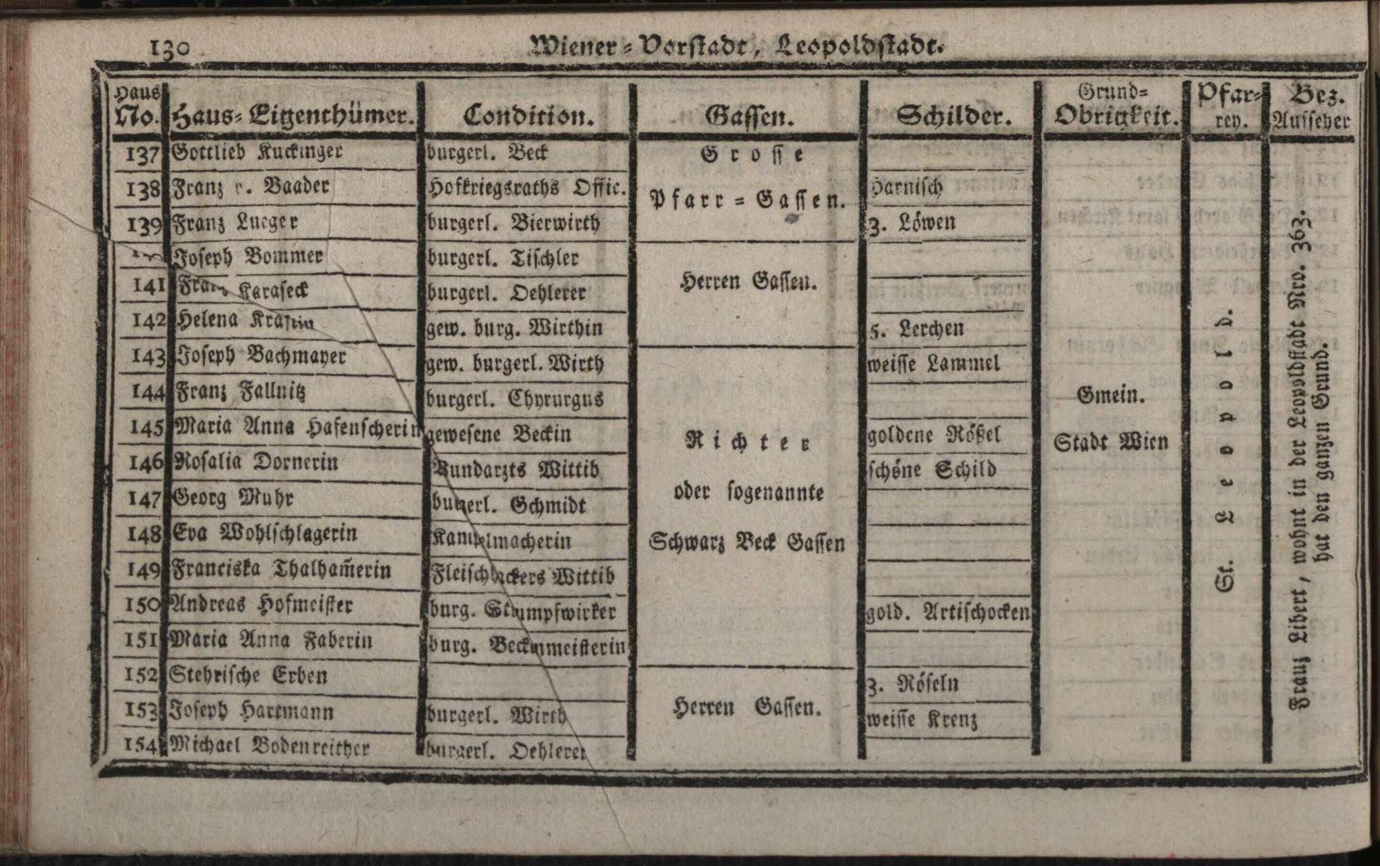 Verzeichniß der in der Kaiserl. Königl. Haupt- und Residenzstadt Wien, sammt dazu gehörigen Vorstädten, und Gründen, befindlichen numerirten Häusern derselben Eigenthümern, und deren Conditionen, Schilderen, Gassen, Grund-Obrigkeiten, Pfarreyen, und derzeit Bezirksaufsehern : auf das genaueste nach denen Grundbüchern entworfen / Von Franz de Ponty