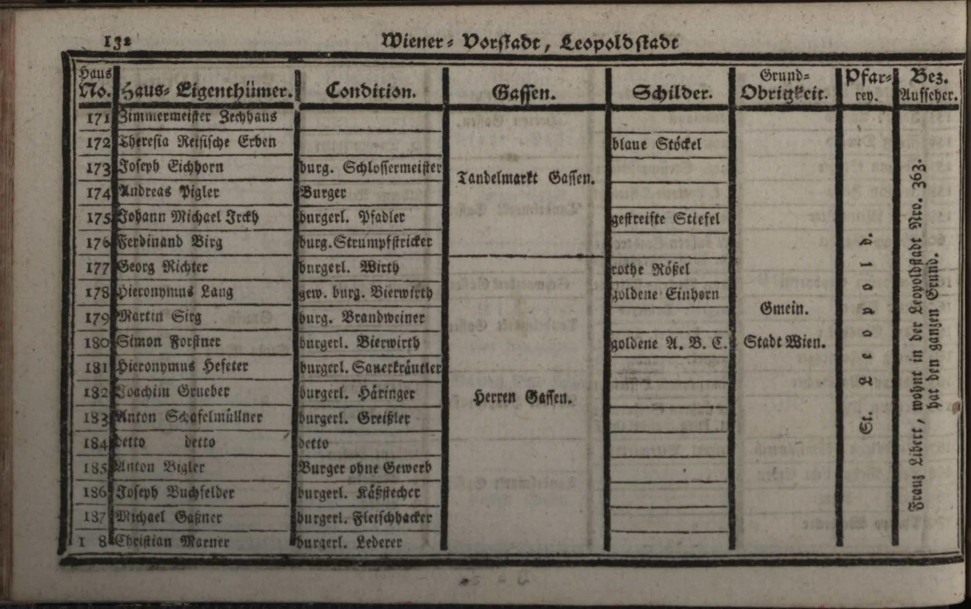 Verzeichniß der in der Kaiserl. Königl. Haupt- und Residenzstadt Wien, sammt dazu gehörigen Vorstädten, und Gründen, befindlichen numerirten Häusern derselben Eigenthümern, und deren Conditionen, Schilderen, Gassen, Grund-Obrigkeiten, Pfarreyen, und derzeit Bezirksaufsehern : auf das genaueste nach denen Grundbüchern entworfen / Von Franz de Ponty