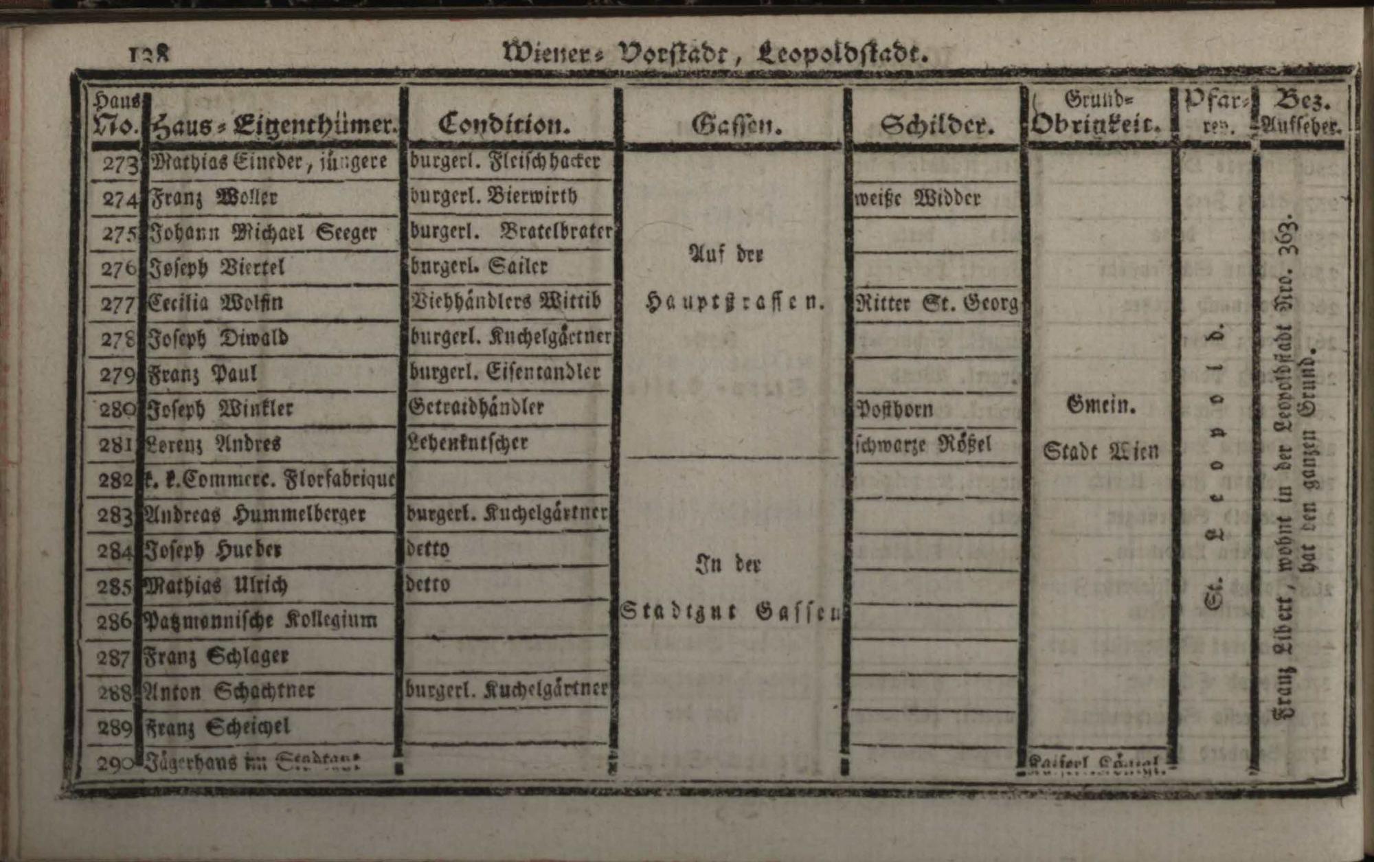 Verzeichniß der in der Kaiserl. Königl. Haupt- und Residenzstadt Wien, sammt dazu gehörigen Vorstädten, und Gründen, befindlichen numerirten Häusern derselben Eigenthümern, und deren Conditionen, Schilderen, Gassen, Grund-Obrigkeiten, Pfarreyen, und derzeit Bezirksaufsehern : auf das genaueste nach denen Grundbüchern entworfen / Von Franz de Ponty