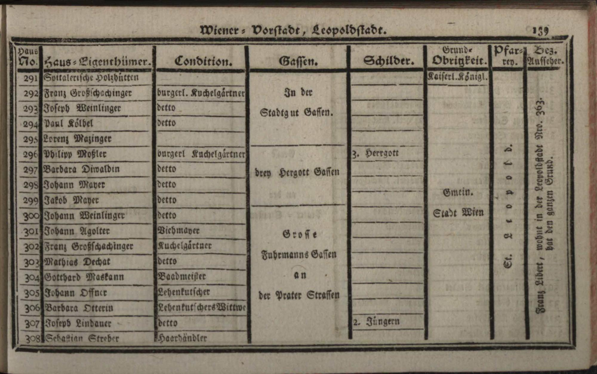Verzeichniß der in der Kaiserl. Königl. Haupt- und Residenzstadt Wien, sammt dazu gehörigen Vorstädten, und Gründen, befindlichen numerirten Häusern derselben Eigenthümern, und deren Conditionen, Schilderen, Gassen, Grund-Obrigkeiten, Pfarreyen, und derzeit Bezirksaufsehern : auf das genaueste nach denen Grundbüchern entworfen / Von Franz de Ponty