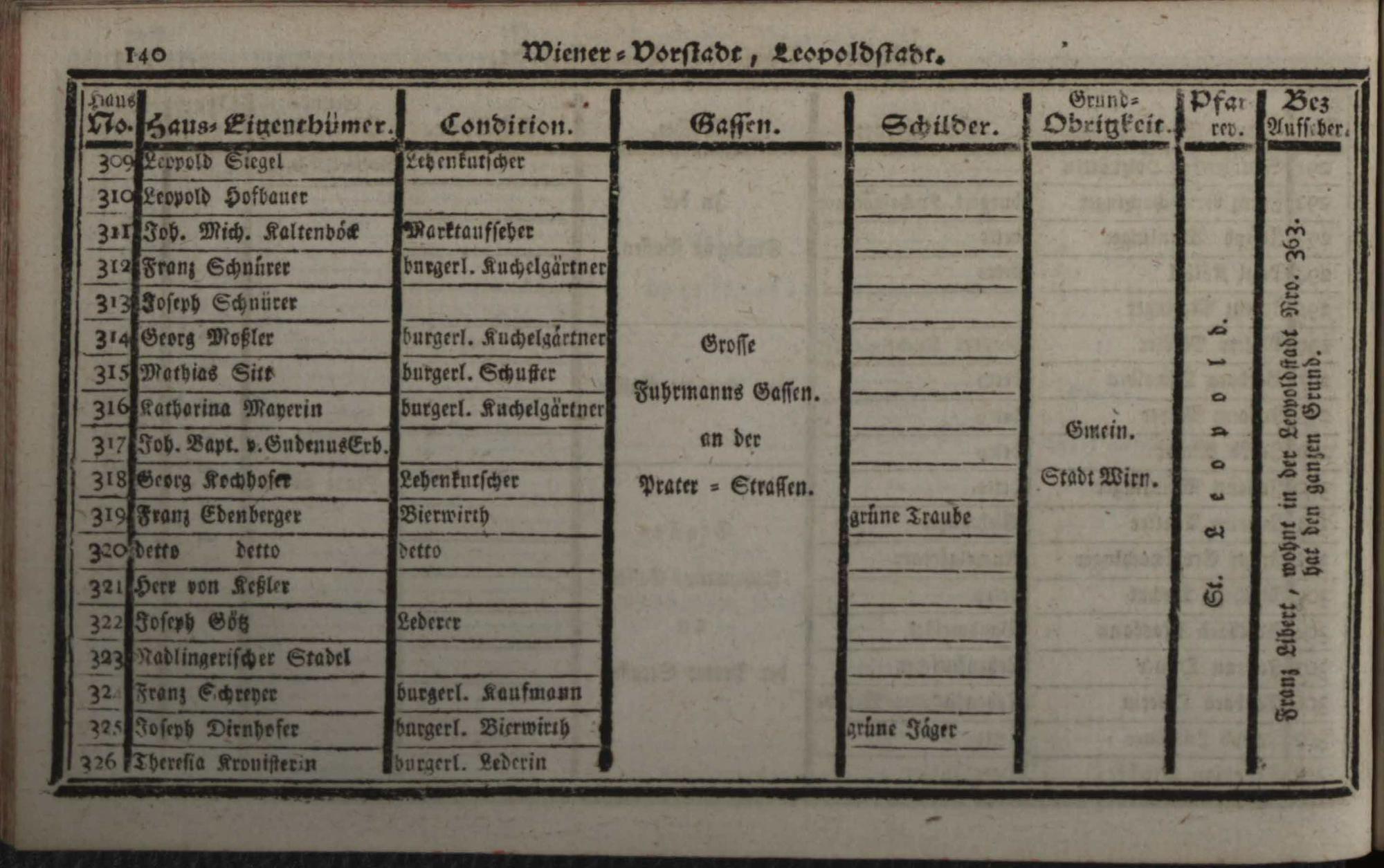 Verzeichniß der in der Kaiserl. Königl. Haupt- und Residenzstadt Wien, sammt dazu gehörigen Vorstädten, und Gründen, befindlichen numerirten Häusern derselben Eigenthümern, und deren Conditionen, Schilderen, Gassen, Grund-Obrigkeiten, Pfarreyen, und derzeit Bezirksaufsehern : auf das genaueste nach denen Grundbüchern entworfen / Von Franz de Ponty