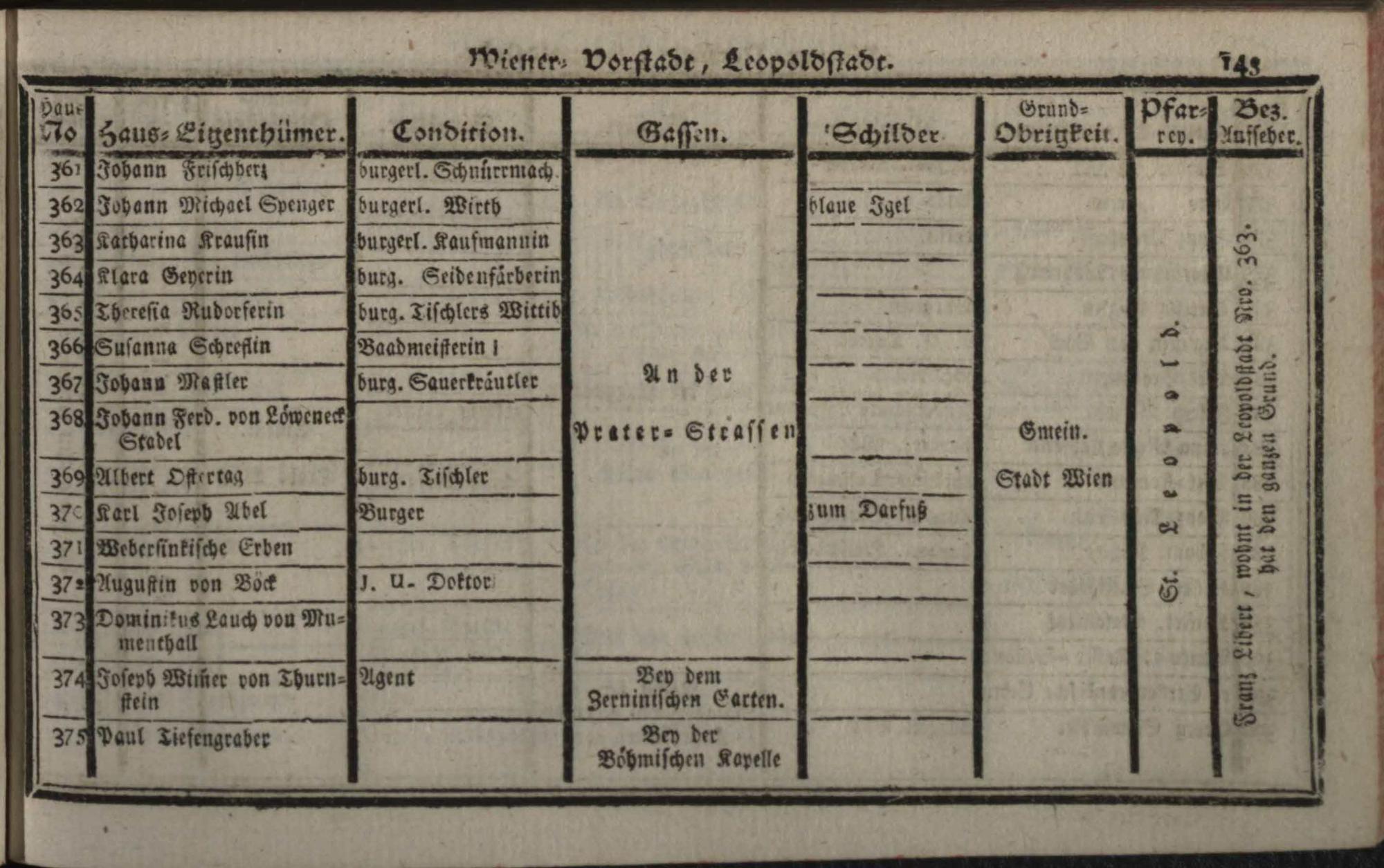 Verzeichniß der in der Kaiserl. Königl. Haupt- und Residenzstadt Wien, sammt dazu gehörigen Vorstädten, und Gründen, befindlichen numerirten Häusern derselben Eigenthümern, und deren Conditionen, Schilderen, Gassen, Grund-Obrigkeiten, Pfarreyen, und derzeit Bezirksaufsehern : auf das genaueste nach denen Grundbüchern entworfen / Von Franz de Ponty