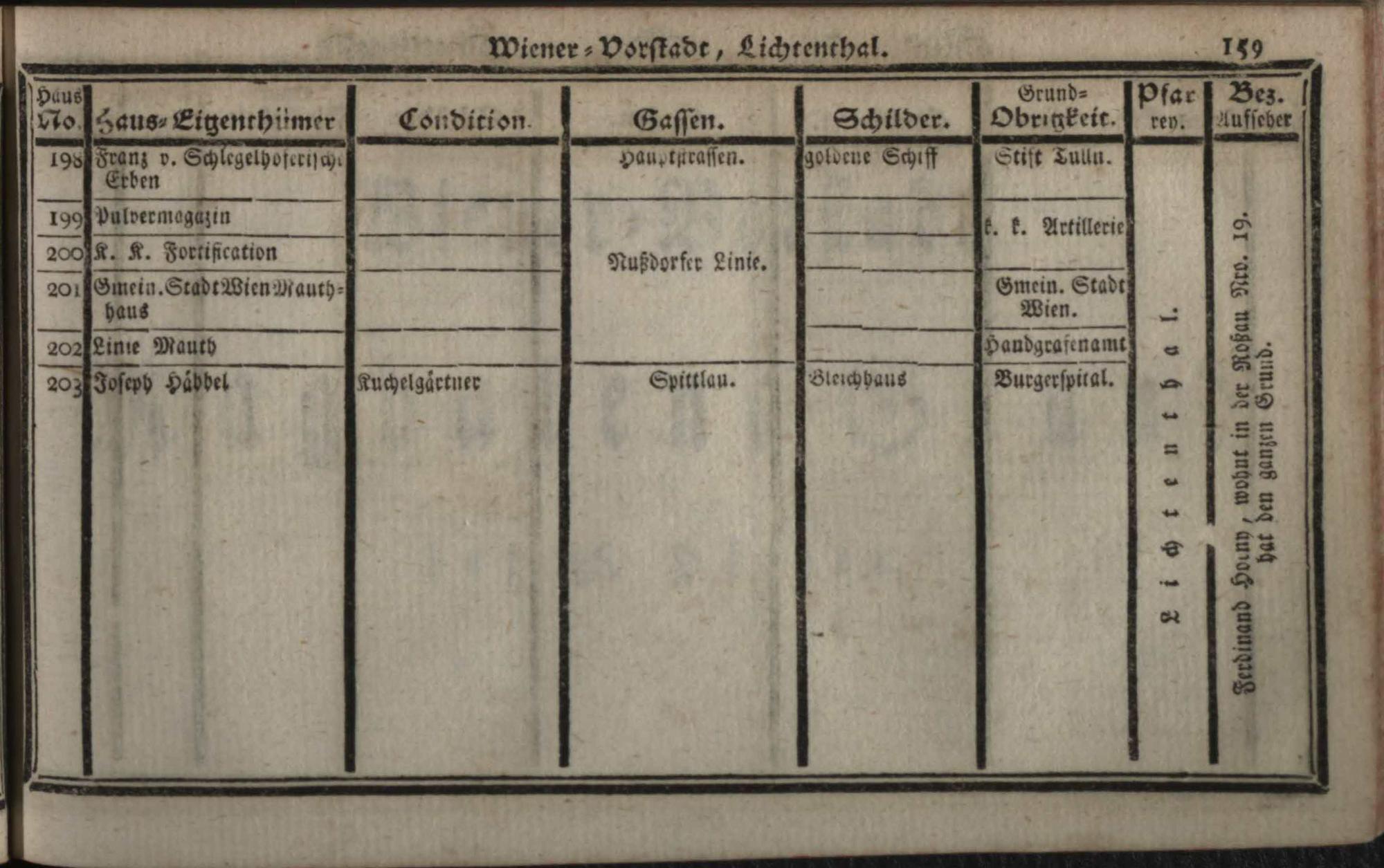 Verzeichniß der in der Kaiserl. Königl. Haupt- und Residenzstadt Wien, sammt dazu gehörigen Vorstädten, und Gründen, befindlichen numerirten Häusern derselben Eigenthümern, und deren Conditionen, Schilderen, Gassen, Grund-Obrigkeiten, Pfarreyen, und derzeit Bezirksaufsehern : auf das genaueste nach denen Grundbüchern entworfen / Von Franz de Ponty