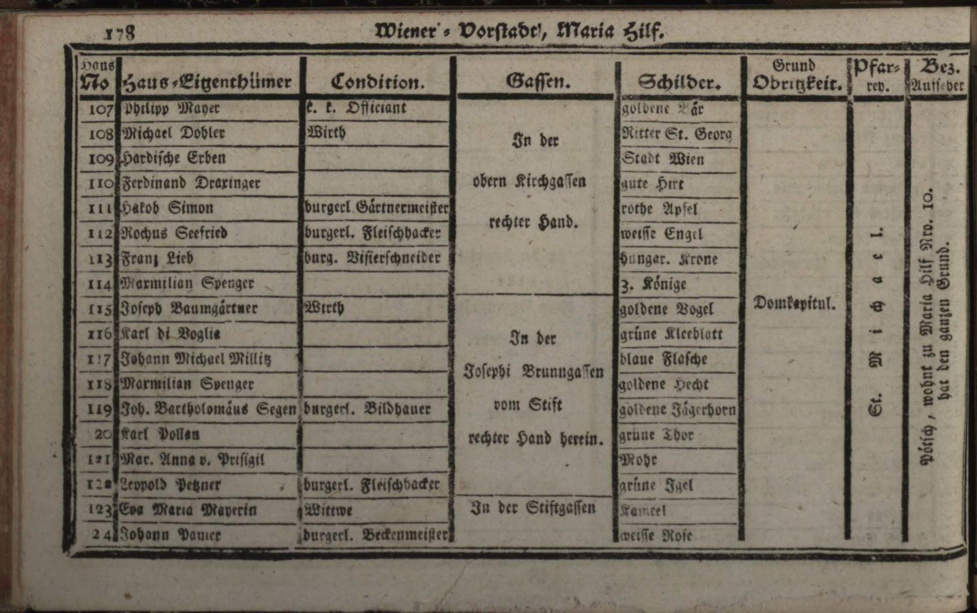 Verzeichniß der in der Kaiserl. Königl. Haupt- und Residenzstadt Wien, sammt dazu gehörigen Vorstädten, und Gründen, befindlichen numerirten Häusern derselben Eigenthümern, und deren Conditionen, Schilderen, Gassen, Grund-Obrigkeiten, Pfarreyen, und derzeit Bezirksaufsehern : auf das genaueste nach denen Grundbüchern entworfen / Von Franz de Ponty