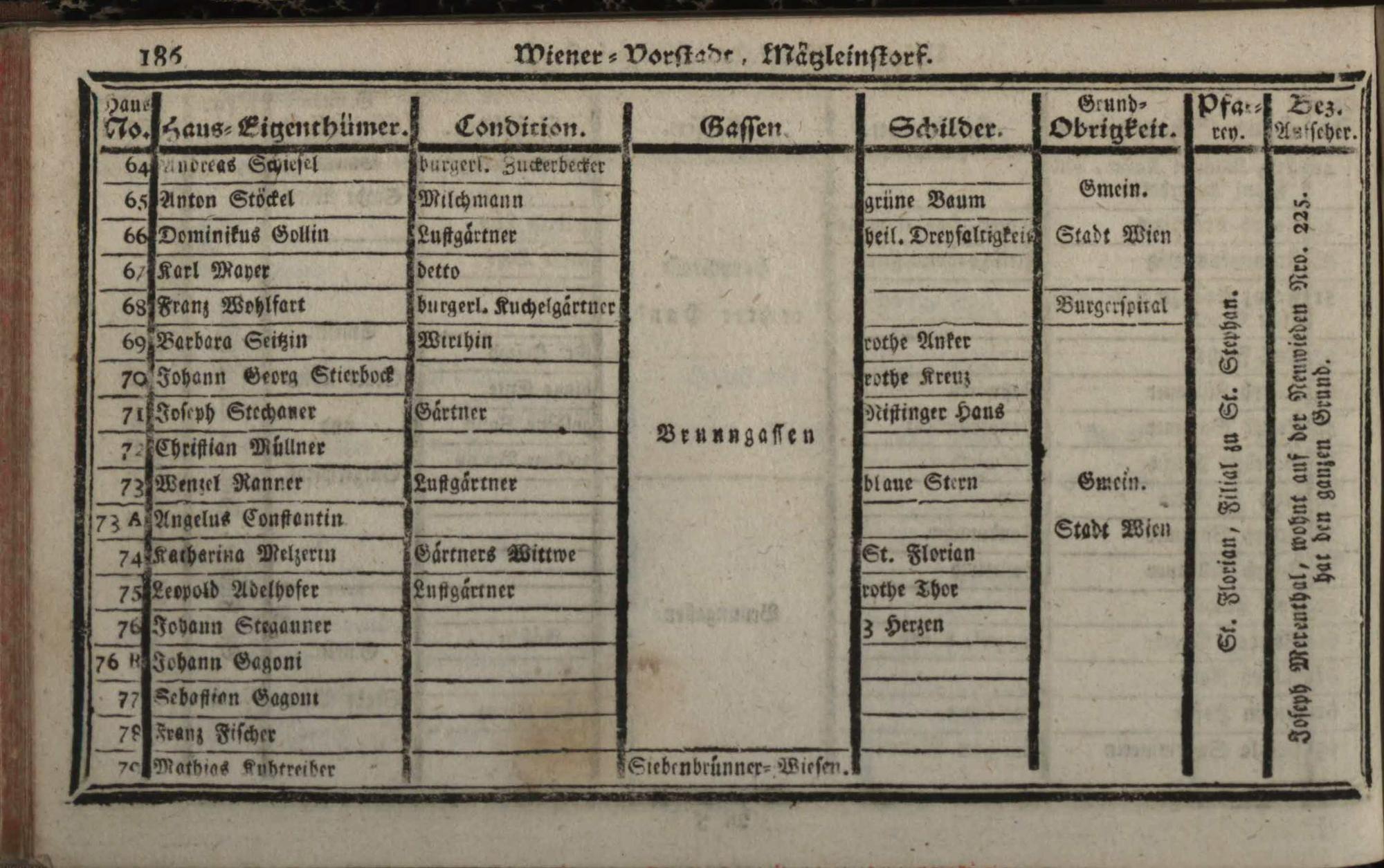 Verzeichniß der in der Kaiserl. Königl. Haupt- und Residenzstadt Wien, sammt dazu gehörigen Vorstädten, und Gründen, befindlichen numerirten Häusern derselben Eigenthümern, und deren Conditionen, Schilderen, Gassen, Grund-Obrigkeiten, Pfarreyen, und derzeit Bezirksaufsehern : auf das genaueste nach denen Grundbüchern entworfen / Von Franz de Ponty