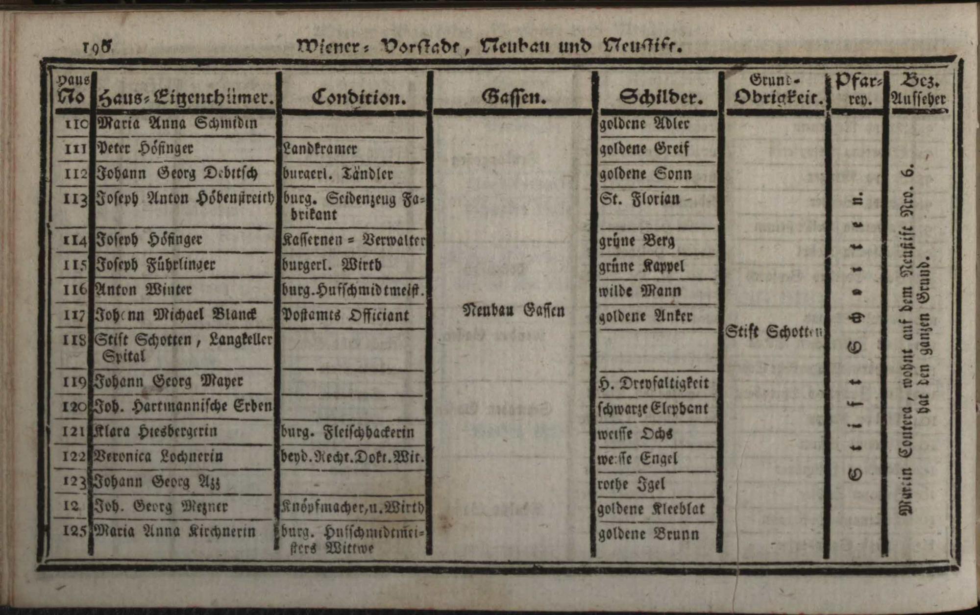 Verzeichniß der in der Kaiserl. Königl. Haupt- und Residenzstadt Wien, sammt dazu gehörigen Vorstädten, und Gründen, befindlichen numerirten Häusern derselben Eigenthümern, und deren Conditionen, Schilderen, Gassen, Grund-Obrigkeiten, Pfarreyen, und derzeit Bezirksaufsehern : auf das genaueste nach denen Grundbüchern entworfen / Von Franz de Ponty