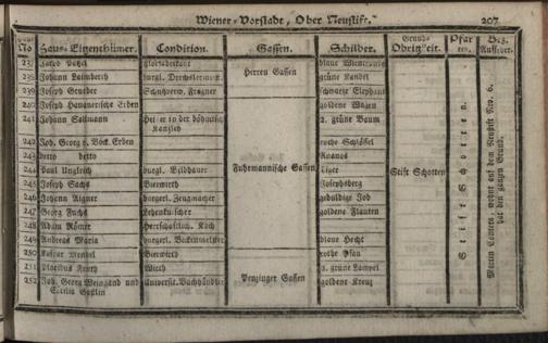 Verzeichniß der in der Kaiserl. Königl. Haupt- und Residenzstadt Wien, sammt dazu gehörigen Vorstädten, und Gründen, befindlichen numerirten Häusern derselben Eigenthümern, und deren Conditionen, Schilderen, Gassen, Grund-Obrigkeiten, Pfarreyen, und derzeit Bezirksaufsehern : auf das genaueste nach denen Grundbüchern entworfen / Von Franz de Ponty