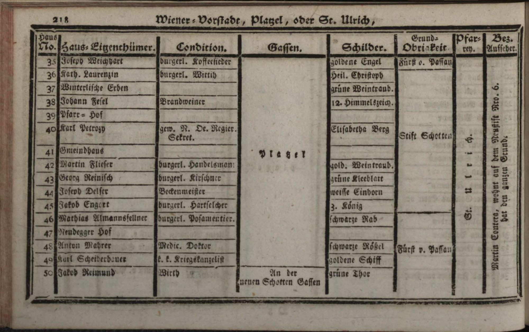 Verzeichniß der in der Kaiserl. Königl. Haupt- und Residenzstadt Wien, sammt dazu gehörigen Vorstädten, und Gründen, befindlichen numerirten Häusern derselben Eigenthümern, und deren Conditionen, Schilderen, Gassen, Grund-Obrigkeiten, Pfarreyen, und derzeit Bezirksaufsehern : auf das genaueste nach denen Grundbüchern entworfen / Von Franz de Ponty