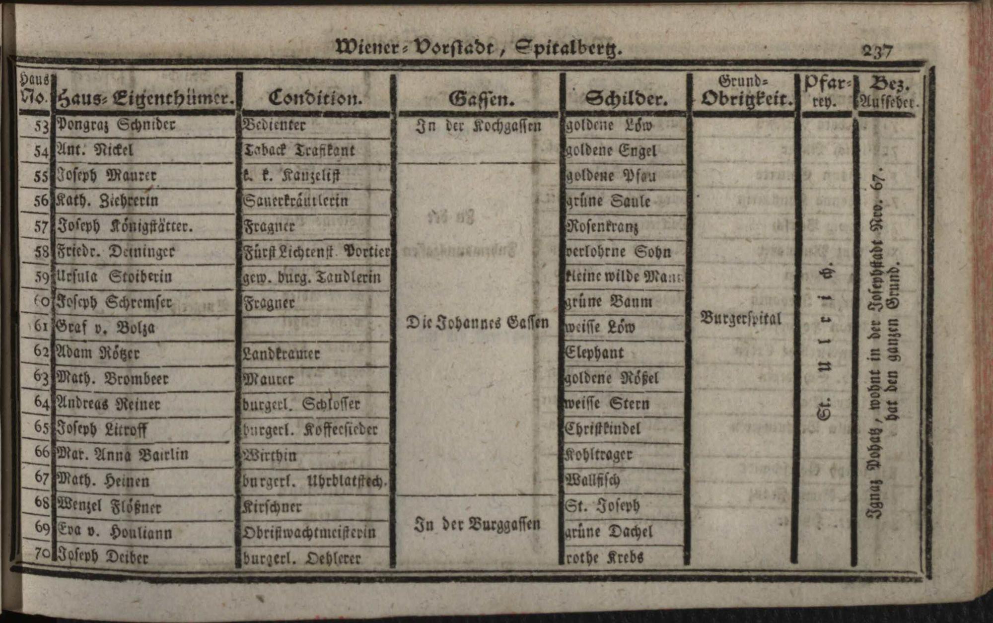 Verzeichniß der in der Kaiserl. Königl. Haupt- und Residenzstadt Wien, sammt dazu gehörigen Vorstädten, und Gründen, befindlichen numerirten Häusern derselben Eigenthümern, und deren Conditionen, Schilderen, Gassen, Grund-Obrigkeiten, Pfarreyen, und derzeit Bezirksaufsehern : auf das genaueste nach denen Grundbüchern entworfen / Von Franz de Ponty